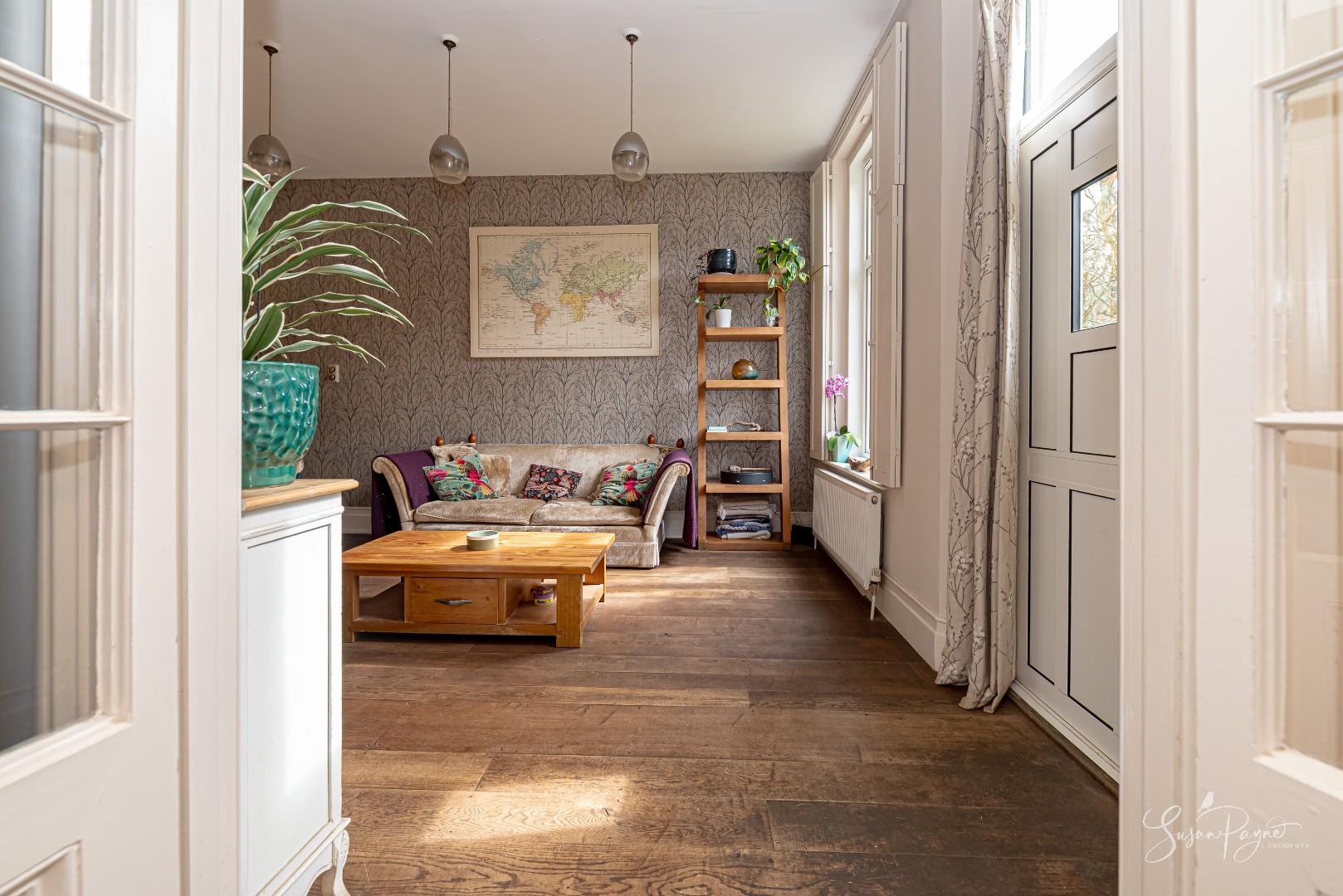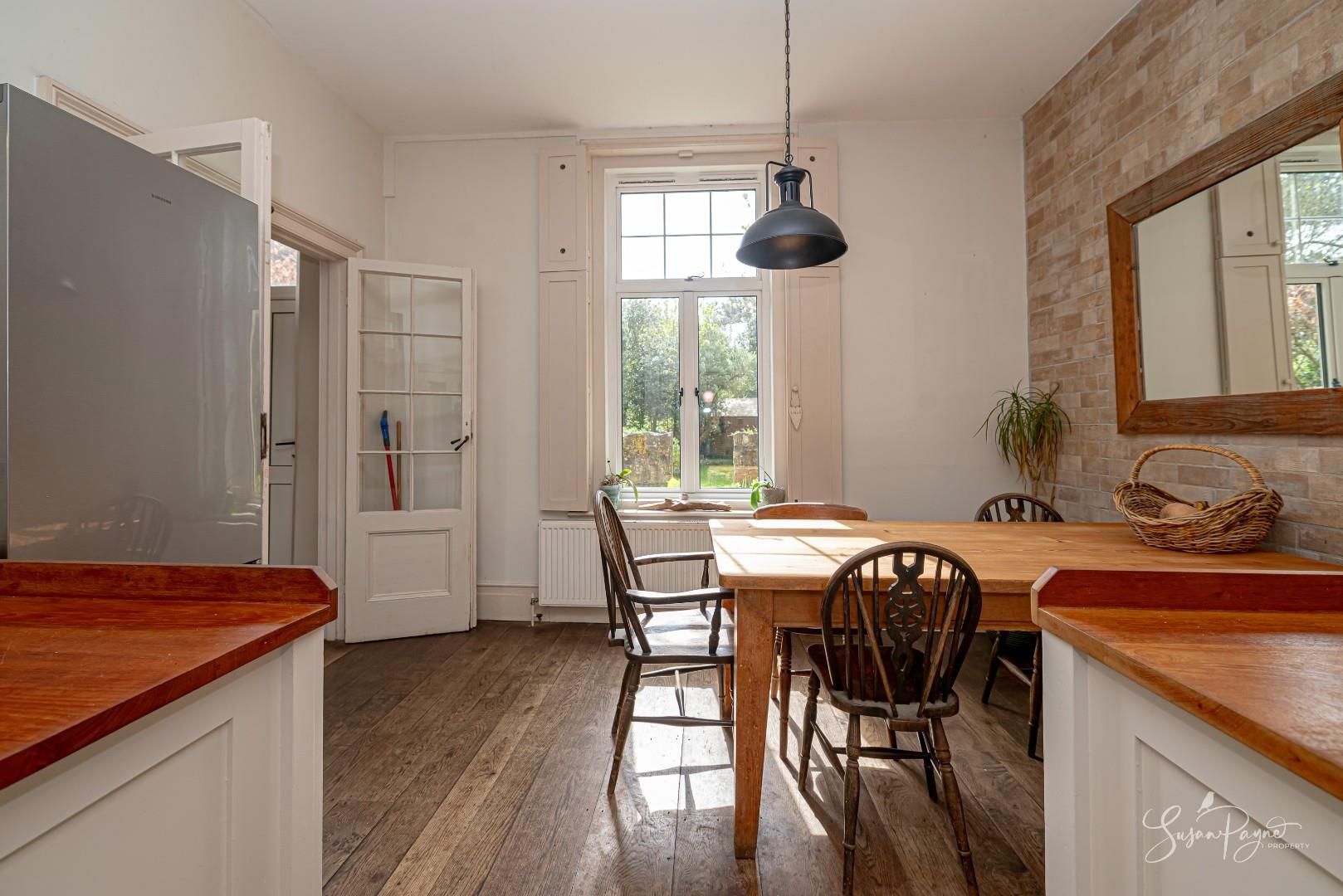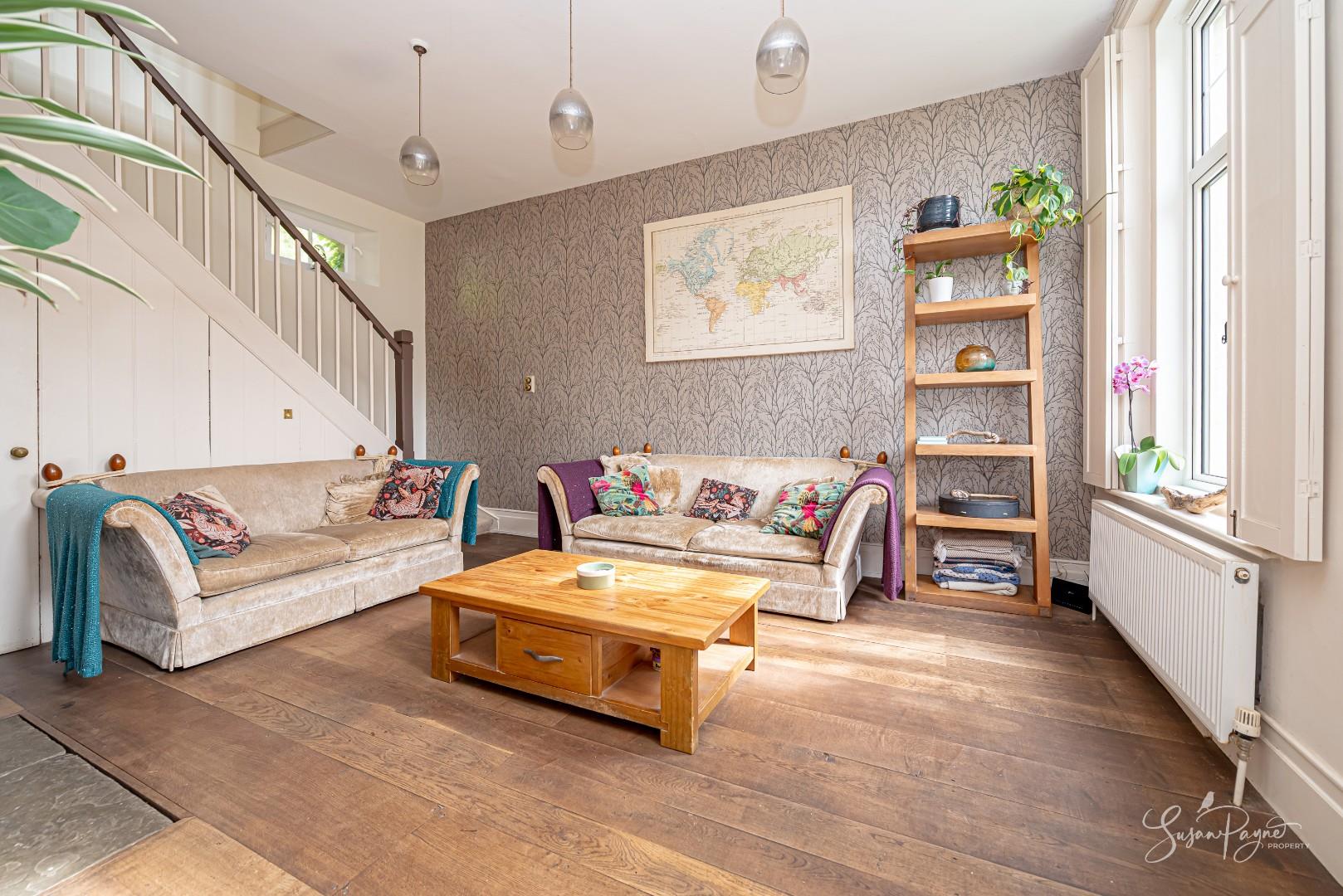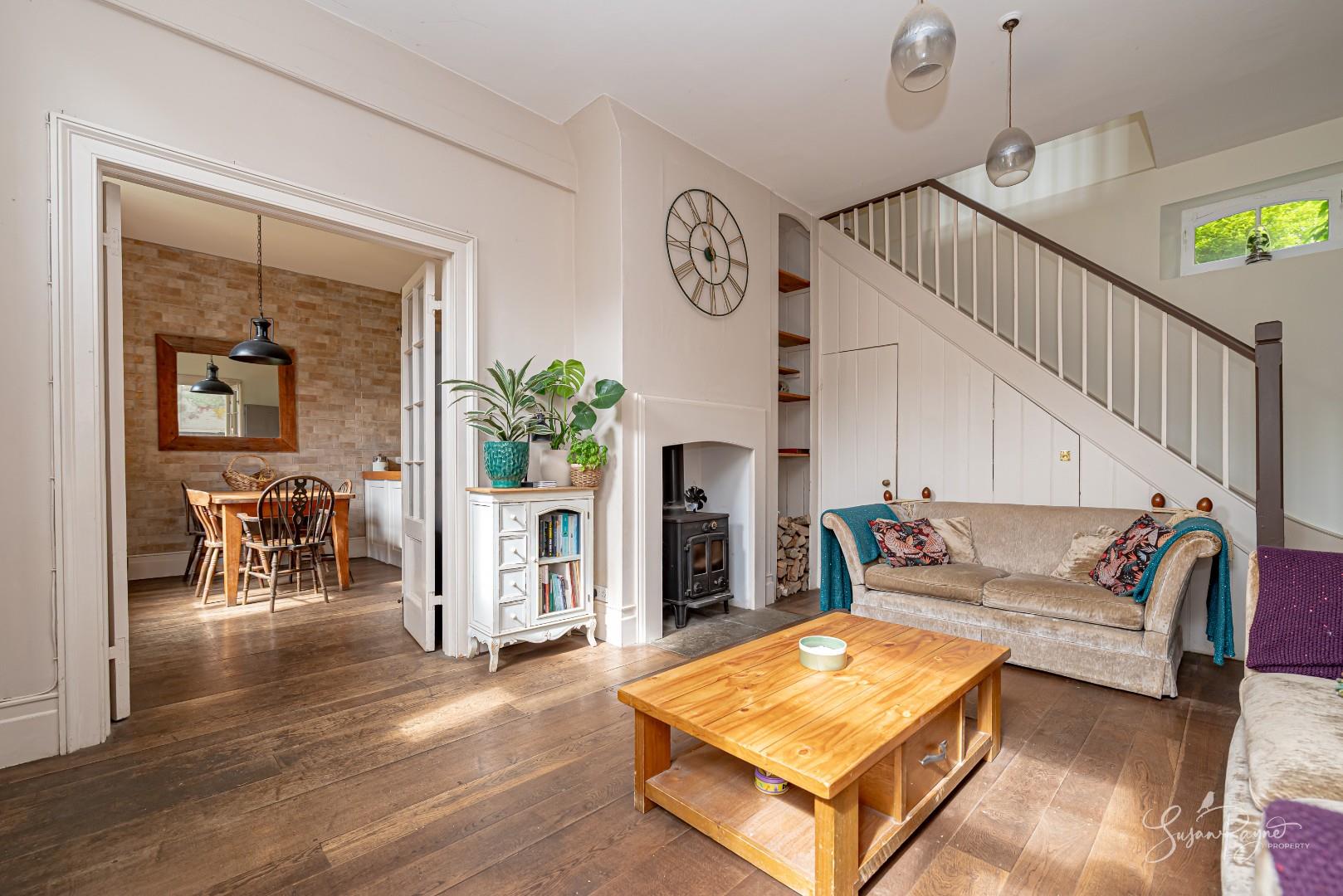 The sitting room is a wonderfully inviting space, where character and comfort combine effortlessly. A wood-burning stove set within a recessed fireplace provides a cosy focal point, while the proportions of the room allow for a flexible layout. The décor is soft and refined, enhancing the sense of calm and elegance, and perfectly complementing the period features. Natural light flows through the space with a large window overlooking the garden, creating a bright yet tranquil environment ideal for both relaxation and hosting. A door provides access to the garden, and stairs lead up to the first-floor landing.