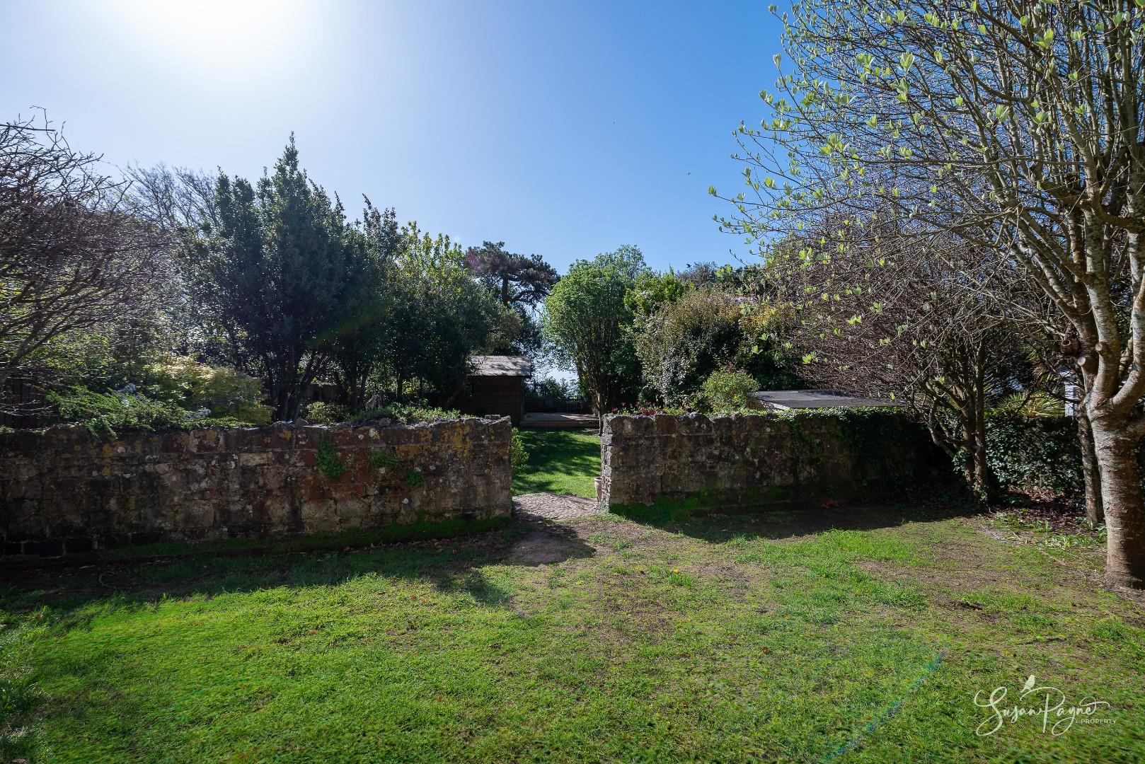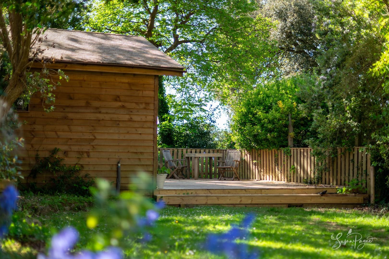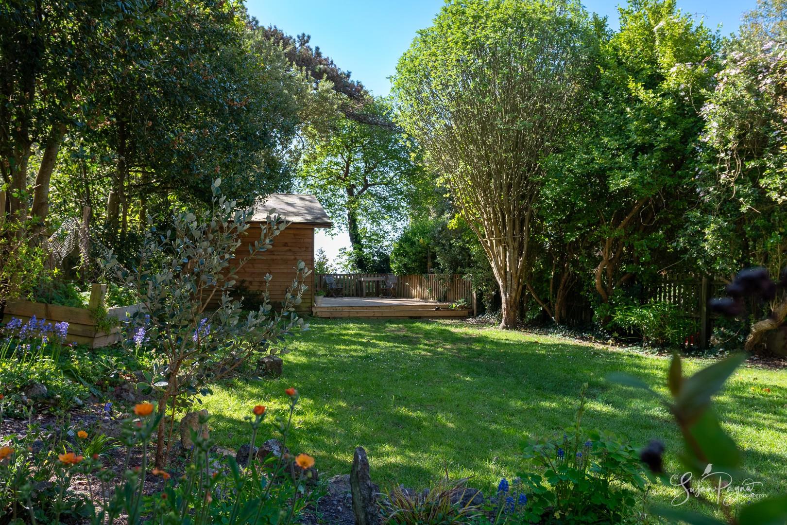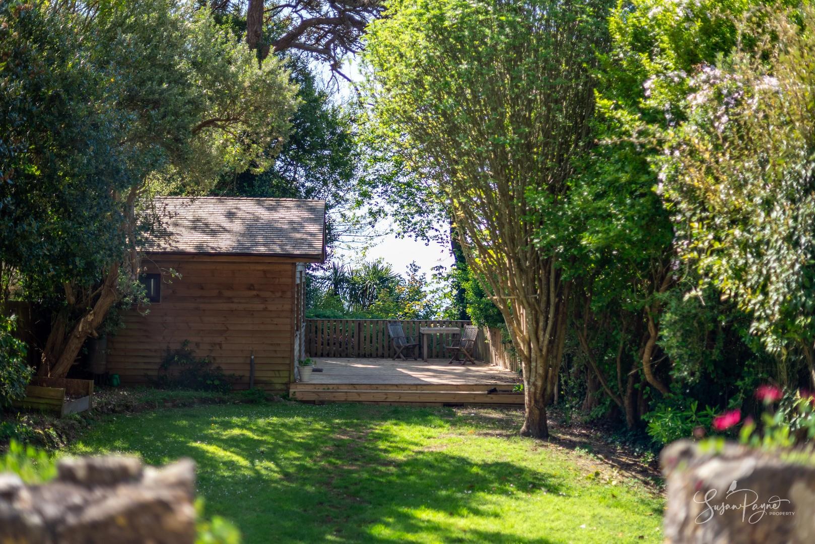 The rear garden is a standout feature - generous in length and beautifully enclosed by mature trees, established planting and characterful stone walls, creating a peaceful, almost woodland-like atmosphere and enhancing privacy. A wide lawn extends from the house, offering space for relaxation and recreation, while towards the far end in front of the chalet, a raised decked terrace provides an ideal spot for outdoor dining. From the rear, there are attractive glimpses of the sea, adding an extra layer of appeal and reinforcing the property’s coastal setting. To the front, a courtyard style garden creates a welcoming entrance, with cobble stones, colourful borders and enclosed by magnificent stone walls. A useful side gate connects to the rear garden