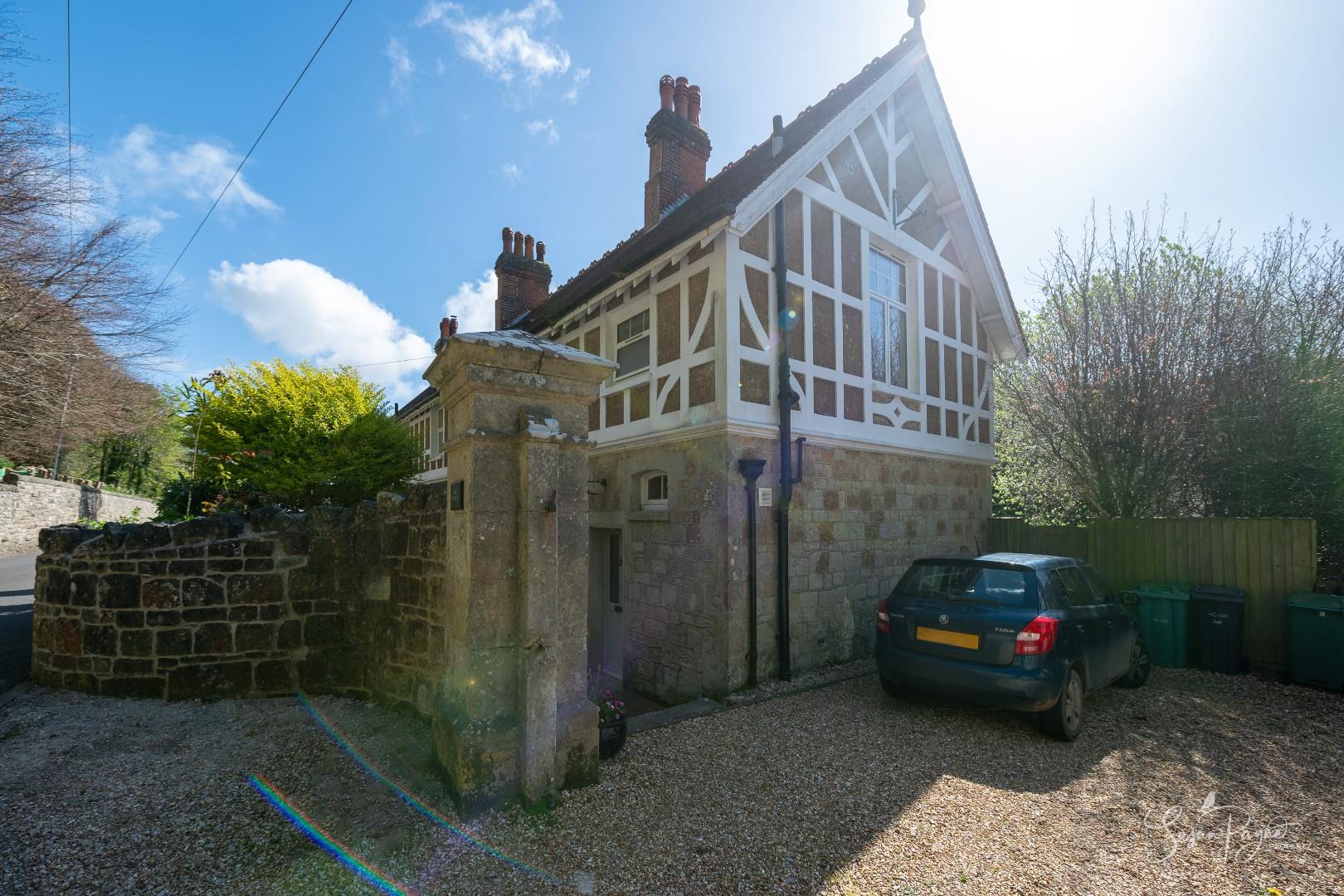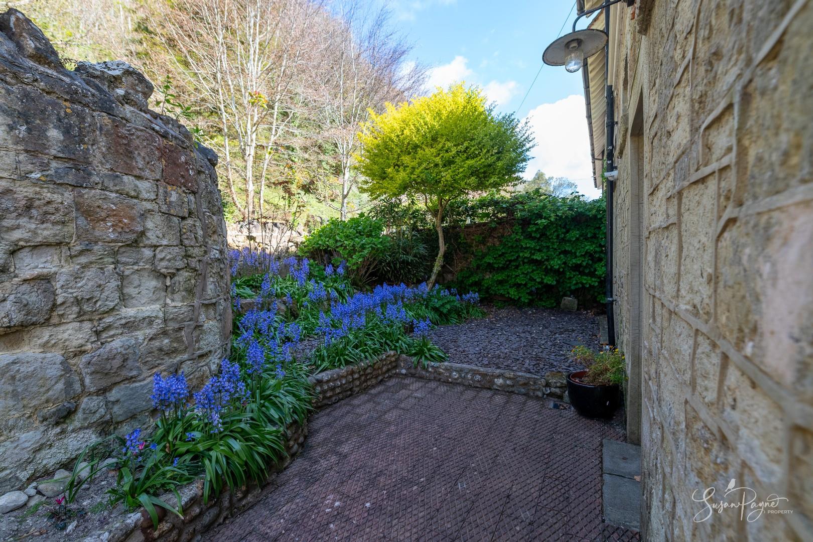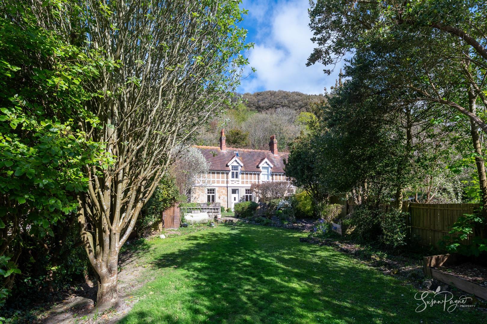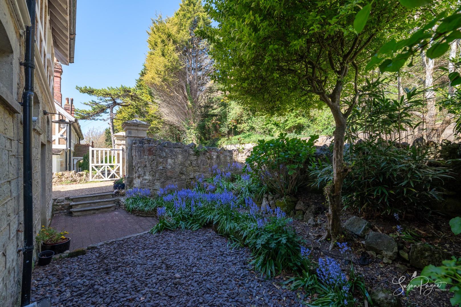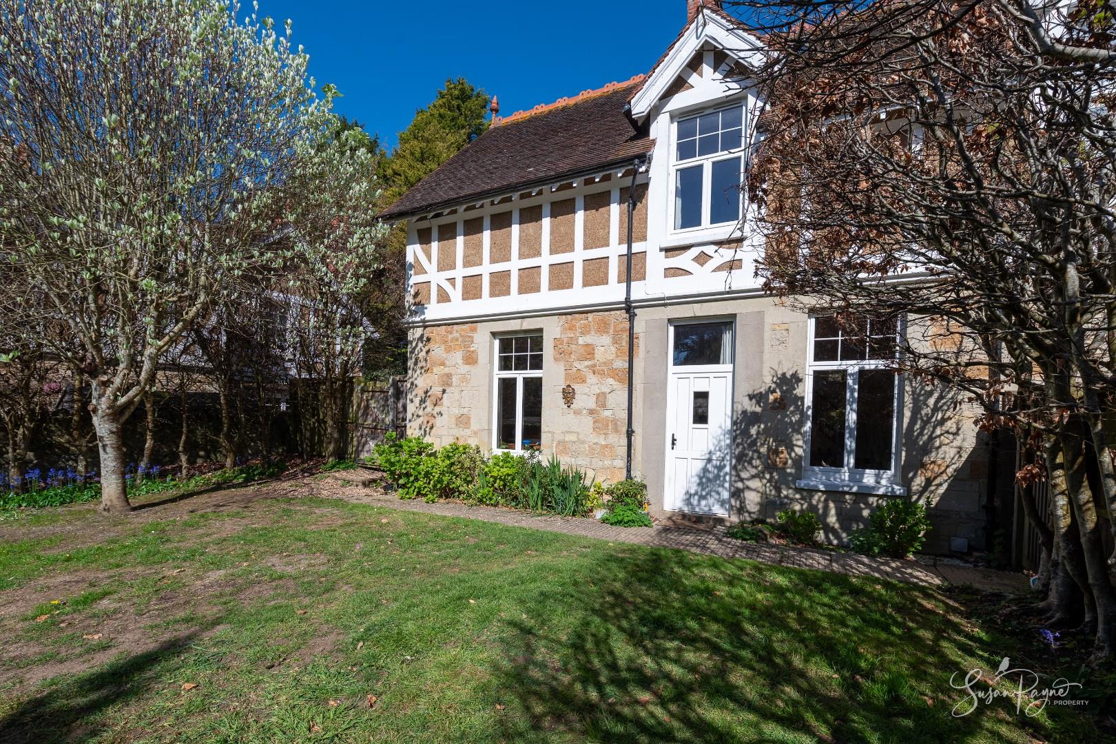 The rear garden is a standout feature - generous in length and beautifully enclosed by mature trees, established planting and characterful stone walls, creating a peaceful, almost woodland-like atmosphere and enhancing privacy. A wide lawn extends from the house, offering space for relaxation and recreation, while towards the far end in front of the chalet, a raised decked terrace provides an ideal spot for outdoor dining. From the rear, there are attractive glimpses of the sea, adding an extra layer of appeal and reinforcing the property’s coastal setting. To the front, a courtyard style garden creates a welcoming entrance, with cobble stones, colourful borders and enclosed by magnificent stone walls. A useful side gate connects to the rear garden