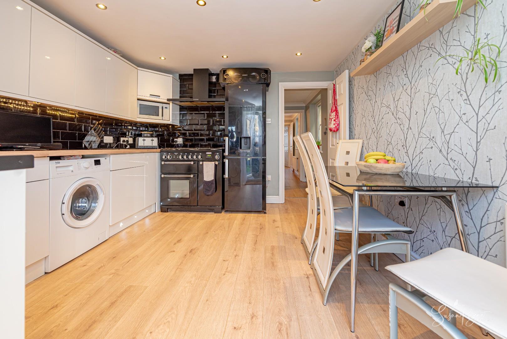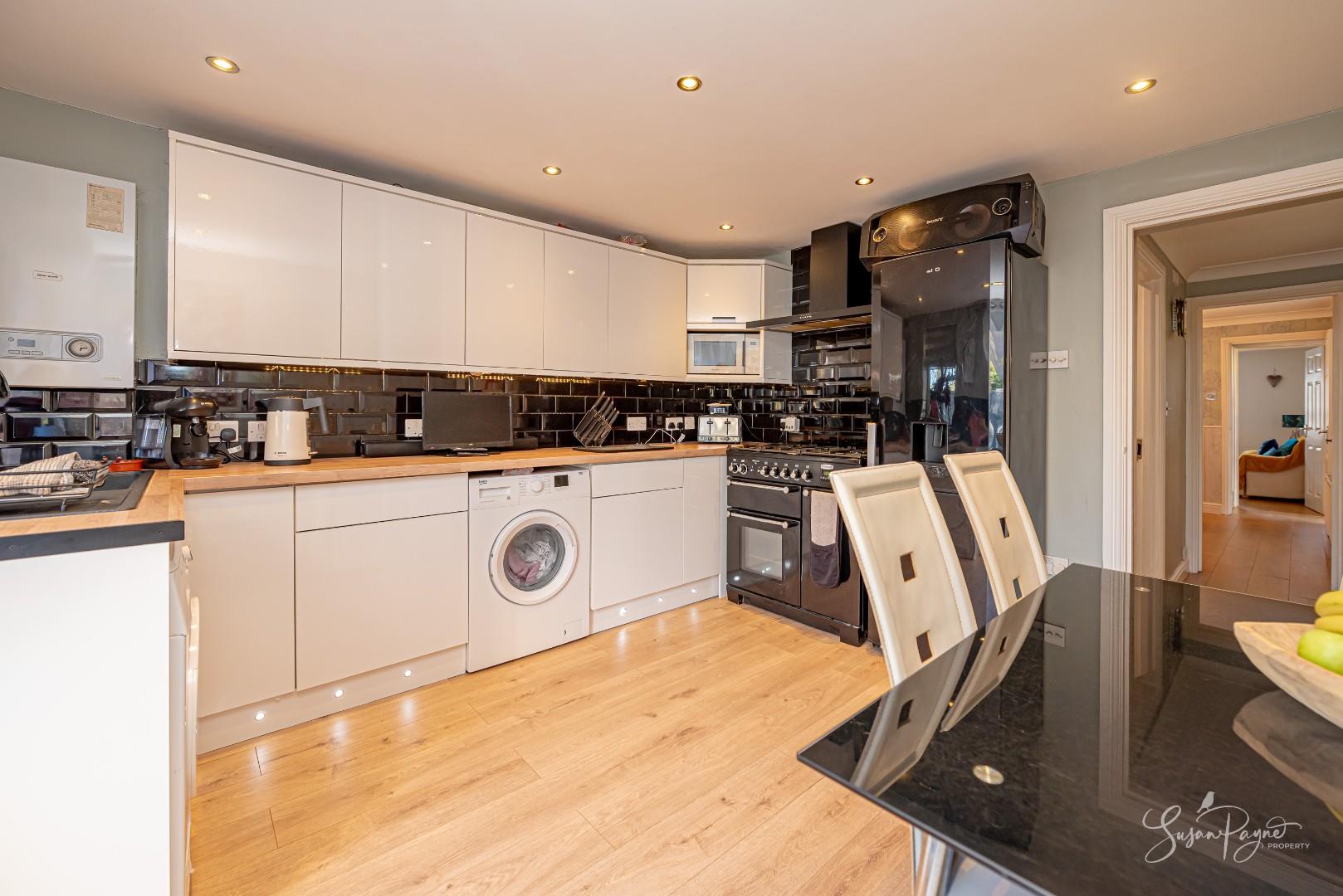 A bright and contemporary space fitted with a range of modern units, complemented by generous work surfaces and integrated appliances. There is ample room for informal dining, while doors open directly onto the garden, enhancing the connection to outdoor living.