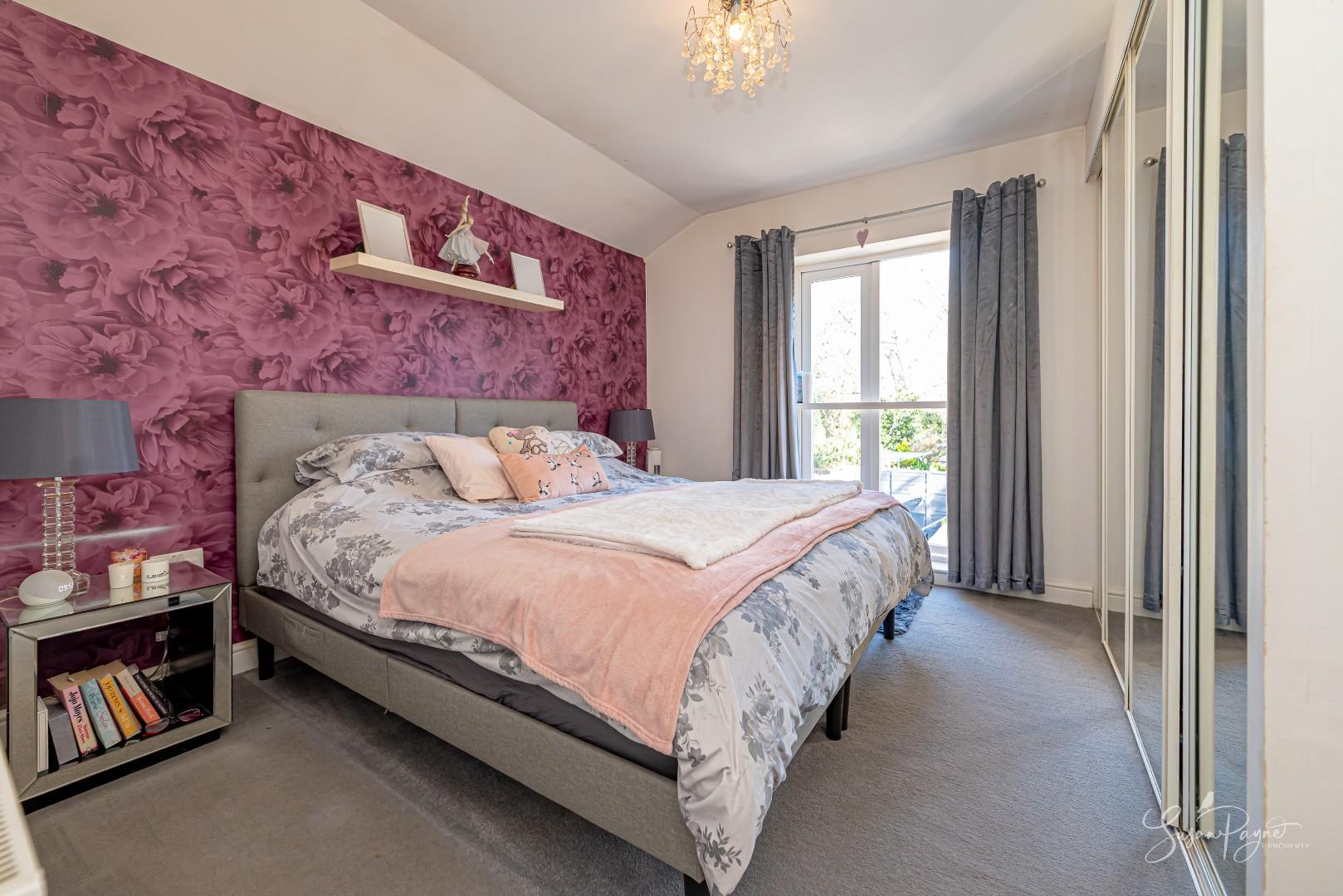 A well-proportioned principal bedroom with a calm and restful atmosphere, enjoying good natural light with French doors providing a lovely outlook over the garden, and useful built-in storage.