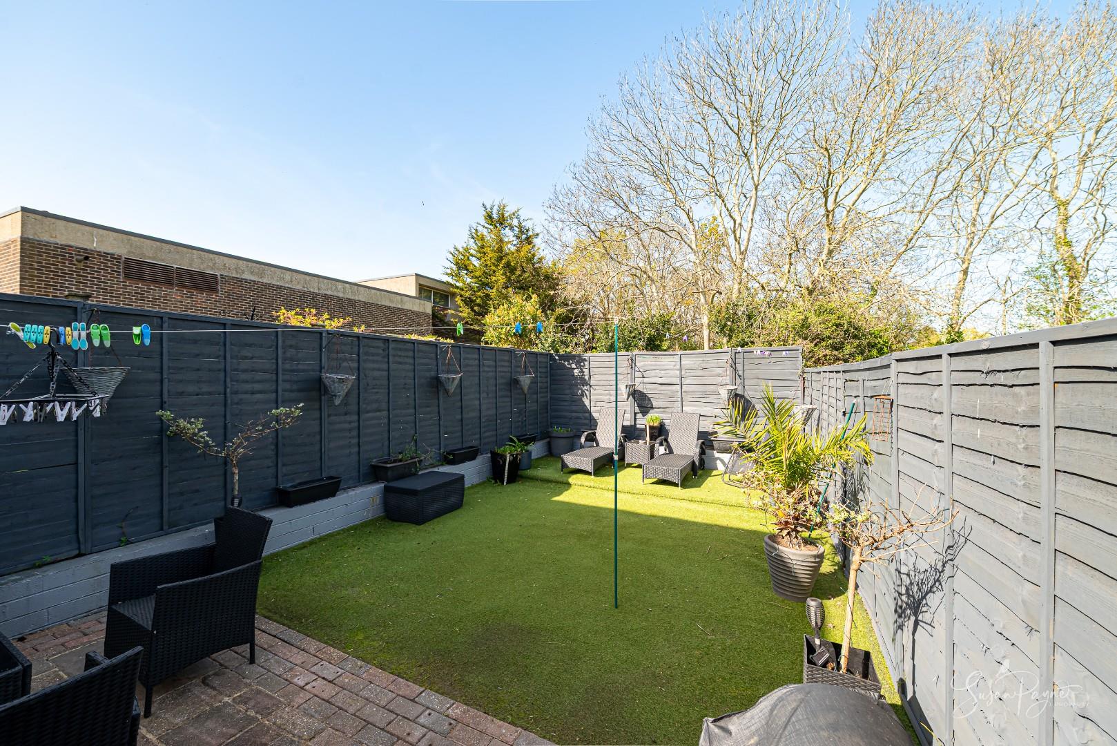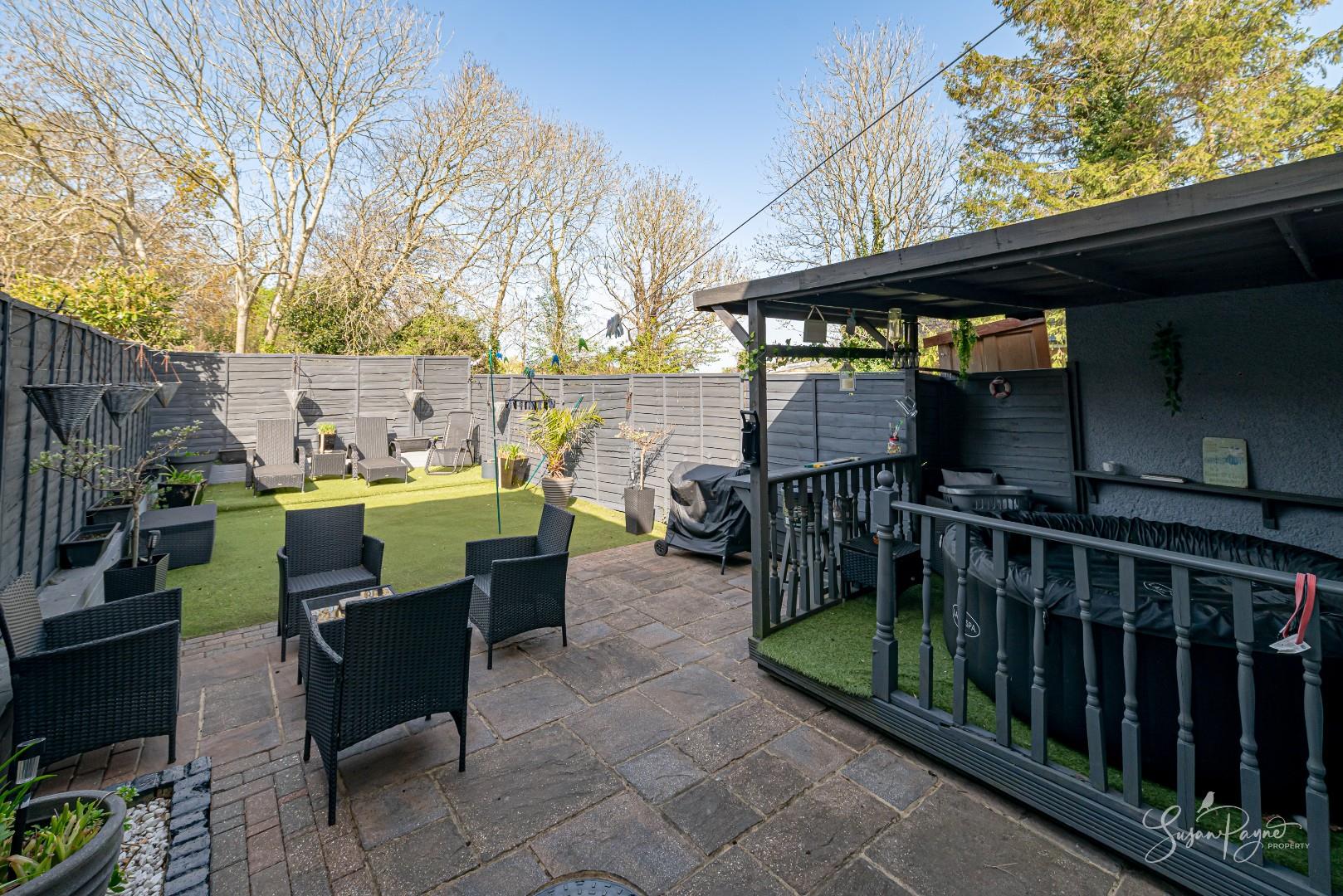 The rear garden has been attractively landscaped to create a low-maintenance yet highly usable outdoor space. A paved terrace provides an ideal setting for outdoor dining, leading onto an area of artificial lawn bordered by contemporary fencing and planting. To the rear, a covered pergola houses a bar and seating area, along with a dedicated hot tub space, making this a perfect environment for entertaining and relaxing alike. The enclosed front garden is neatly arranged with gravel and planting, complementing the property’s welcoming approach.