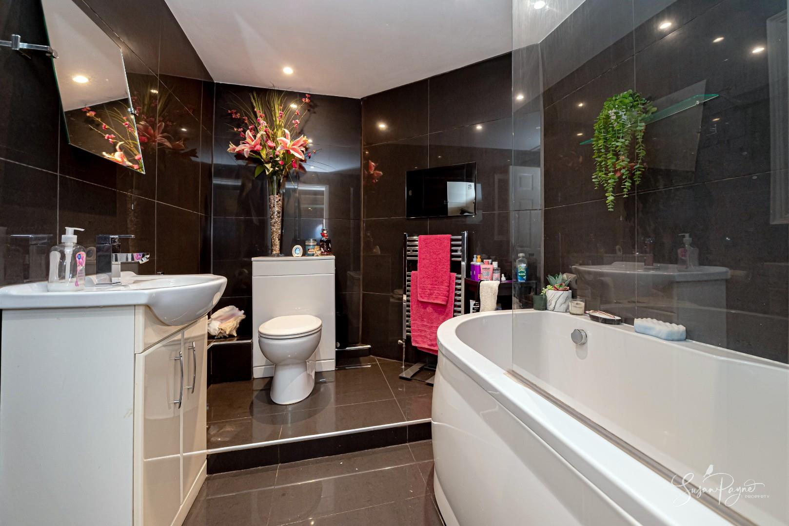 A stylishly appointed ground floor bathroom featuring a modern suite, including a panelled bath with shower over, wash basin set within a vanity unit and WC, finished with sleek tiling.