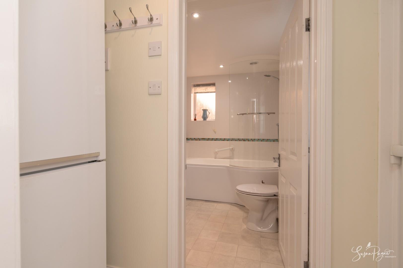 Beautifully finished with a modern suite and neutral wall tiling with a decorative surround, this bathroom is equipped with a shower over bath, a WC, and a pedestal hand basin, plus there is a large chrome heated towel rail to keep the room cosy. Benefitting from dual aspect windows to the rear and side, the space is naturally light and offers an extractor fan.