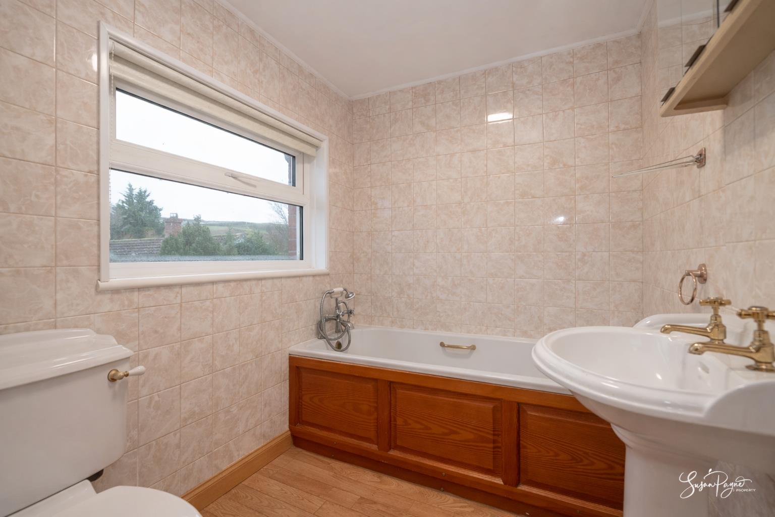 Enjoying wonderful views of the downs to the side, this lovely family bathroom features a bath with a shower attachment, a WC, and a pedestal hand basin.