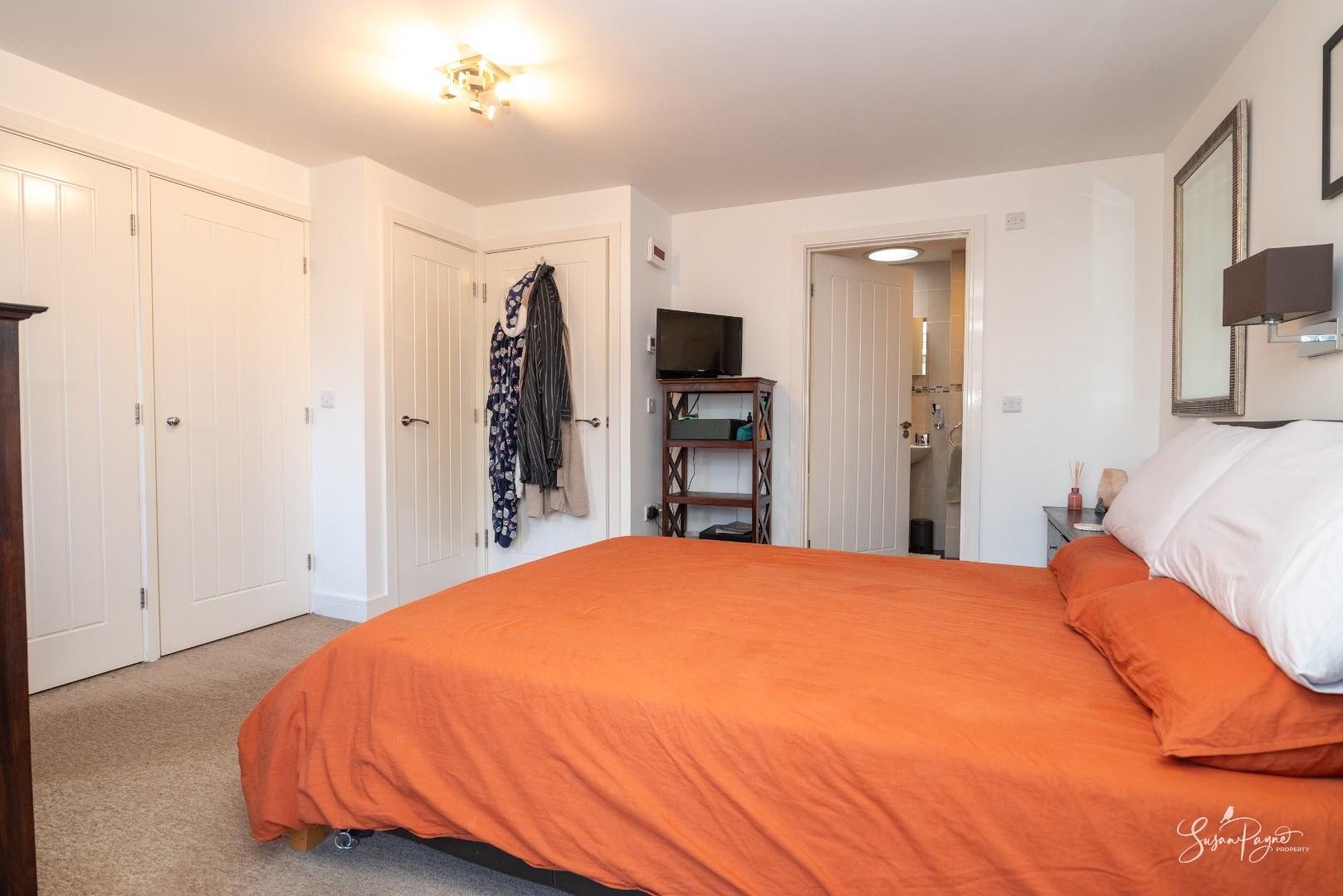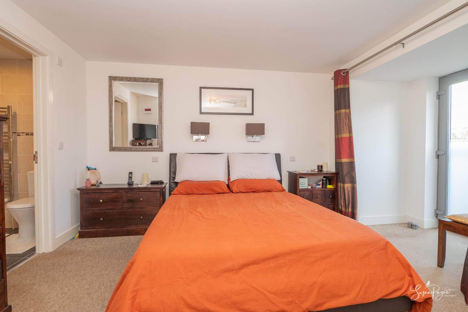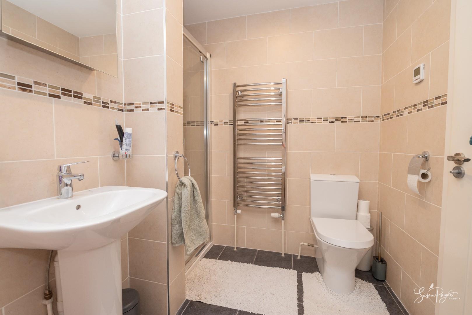 The second bedroom is another well-proportioned double, offering flexibility for use as a guest room, home office, or additional living space. There is an en-suite shower room here and access to a built-in wardrobe.