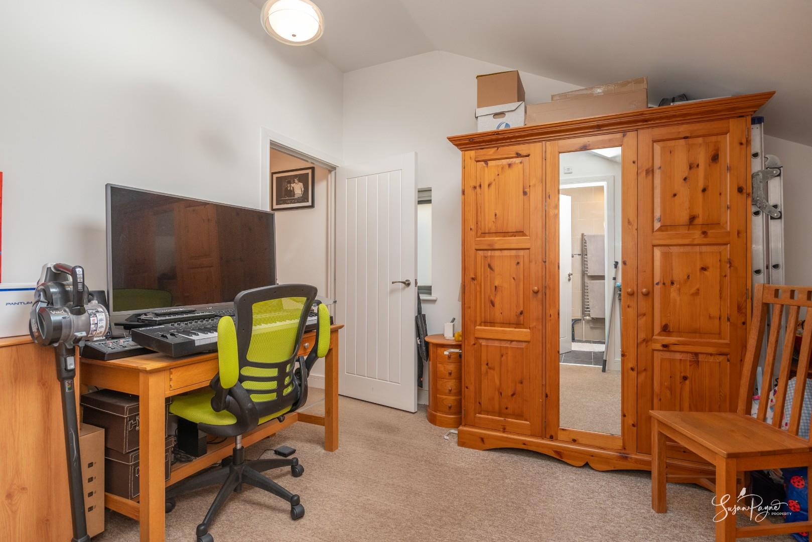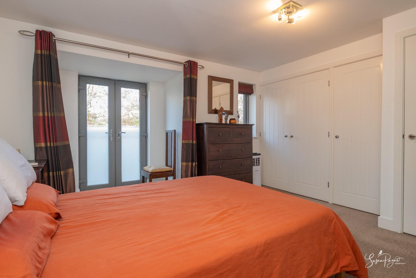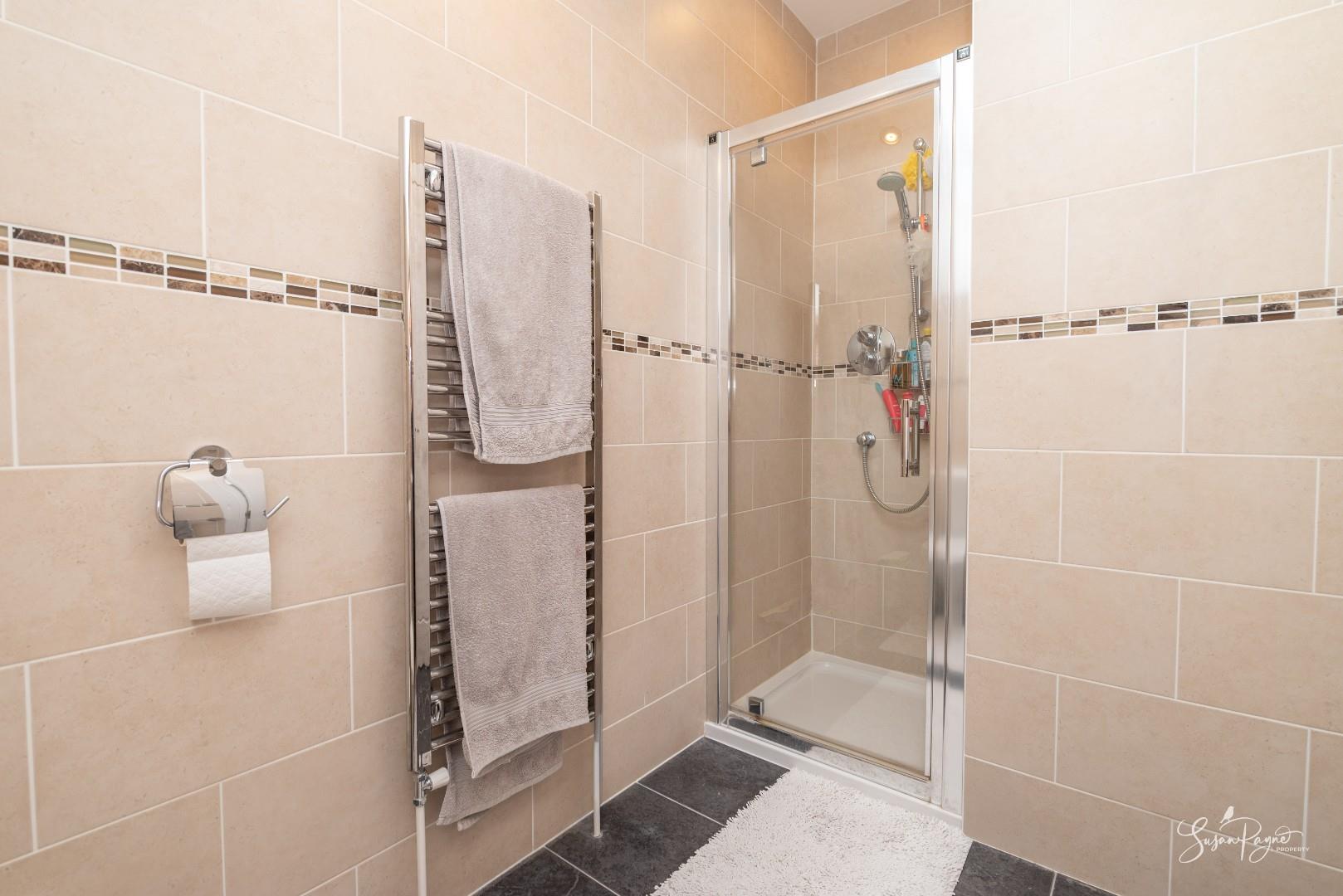 The second bedroom is another well-proportioned double, offering flexibility for use as a guest room, home office, or additional living space. There is an en-suite shower room here and access to a built-in wardrobe.