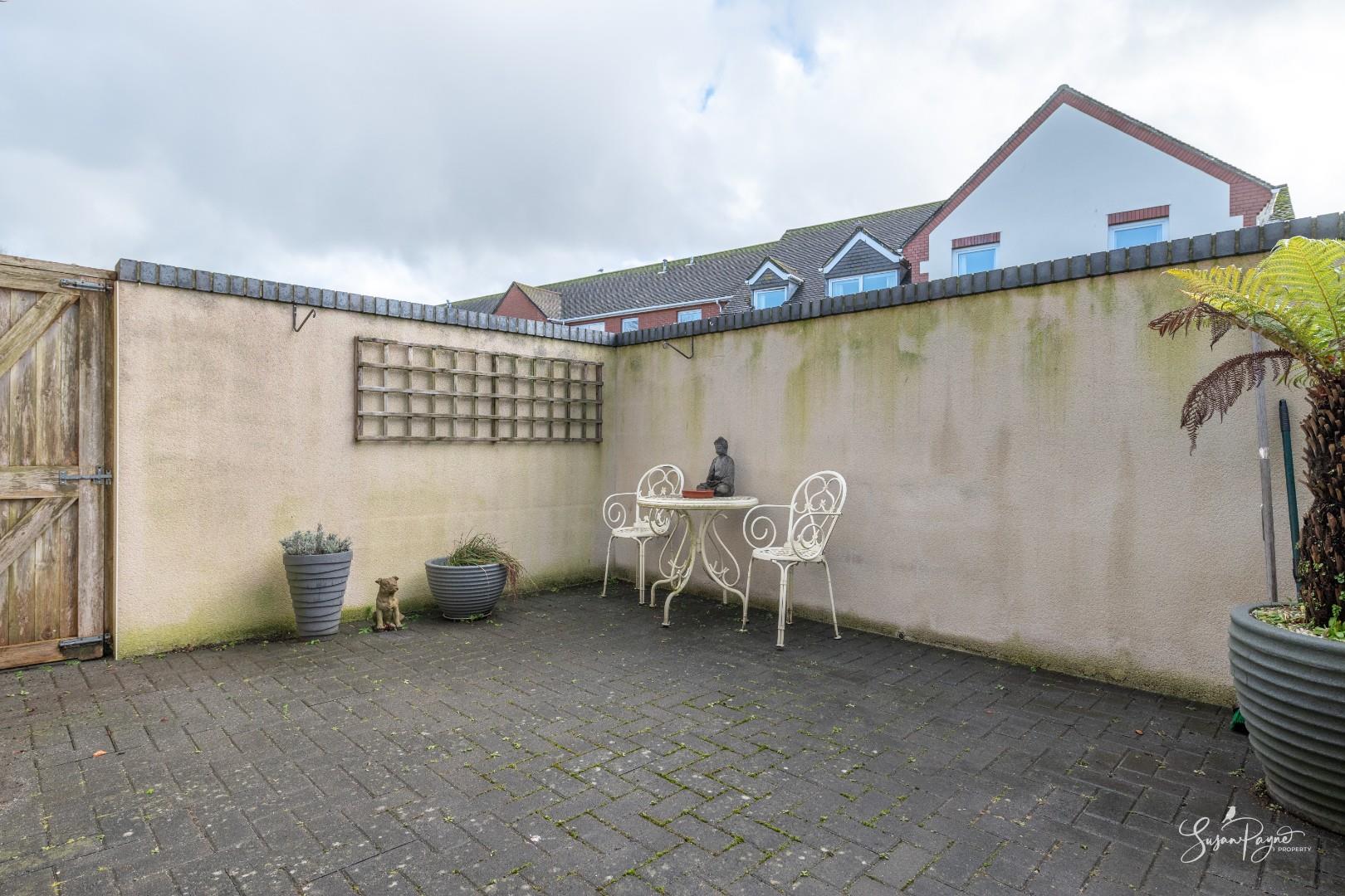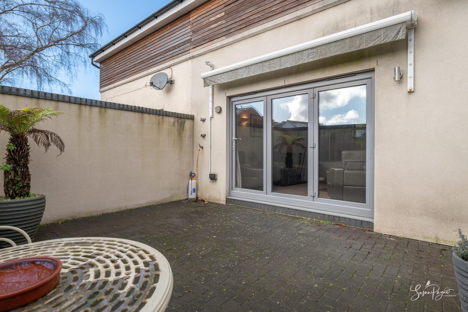 To the rear of the property is a private enclosed courtyard garden, designed for easy maintenance and year-round enjoyment. The paved area provides an ideal setting for outdoor dining or relaxing, with direct access from the living room enhancing the sense of space. An electric awning provides shade from the summer sun, making the space enjoyable even on the hottest days.