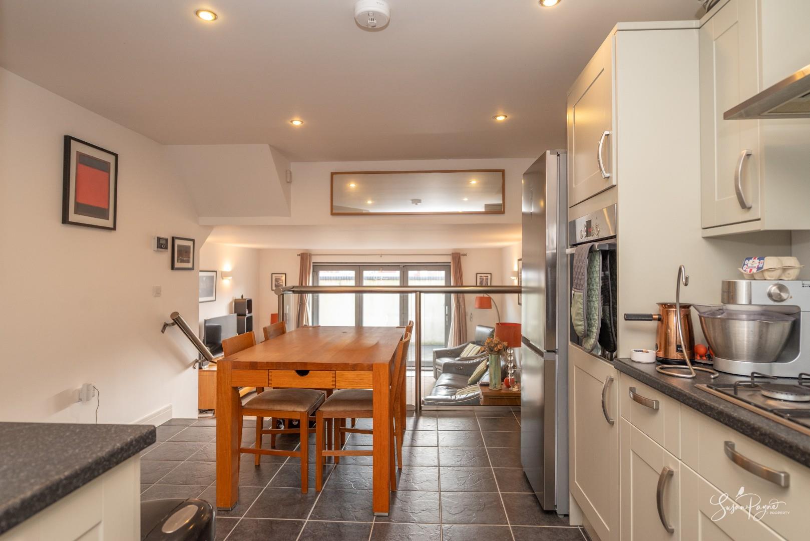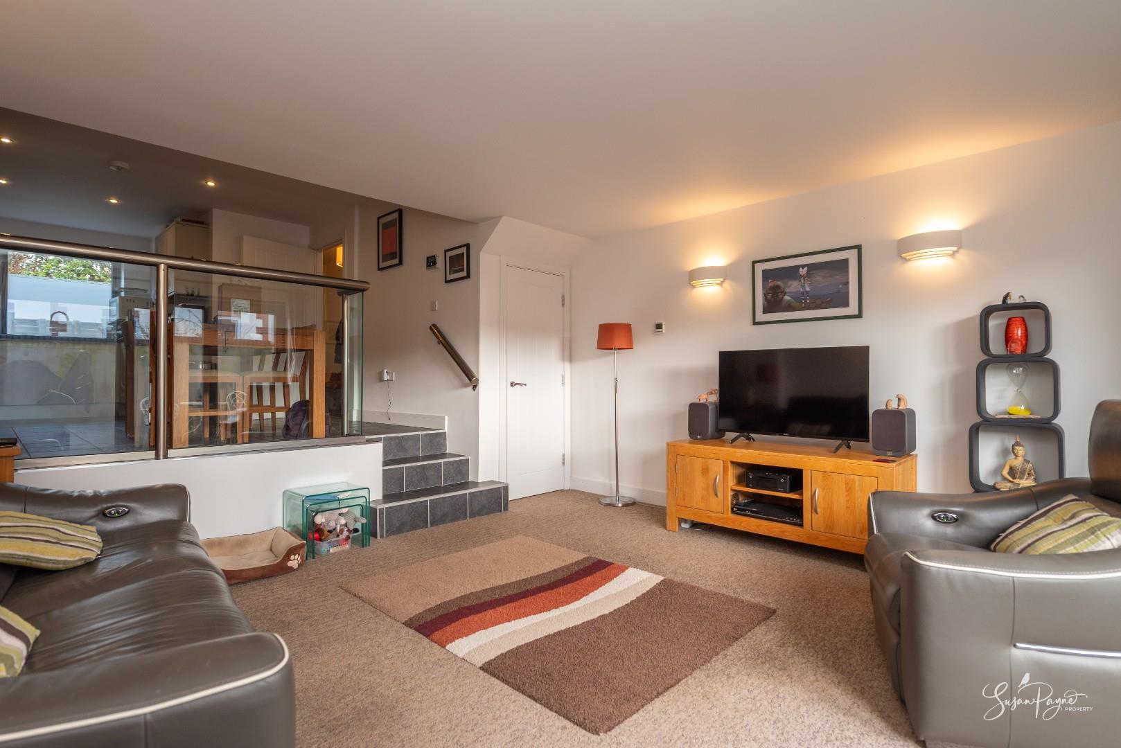 Well arranged and naturally light, the kitchen and dining area offer an excellent sociable space at the heart of the home. Fitted with a range of contemporary units and work surfaces, the kitchen provides ample storage and integrated appliances, including an electric oven, a dishwasher, and a gas hob. There is plenty of room for a dining table, making this an ideal space for all the family. A few steps lead down to the living space which is semi open plan with the living room.