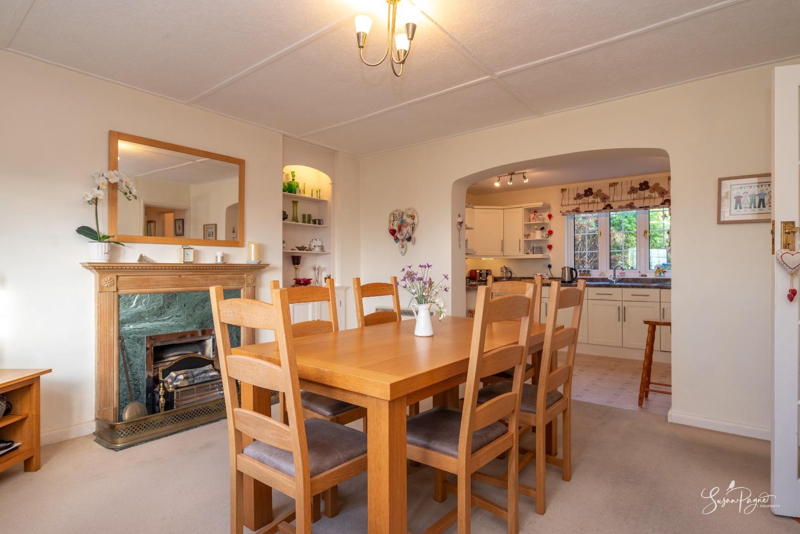 A superb family space positioned at the heart of the home, the dining room offers plenty of room for a large table and chairs. A charming fireplace forms an attractive focal point, and an open archway flows seamlessly into the kitchen, creating a sociable and practical layout.