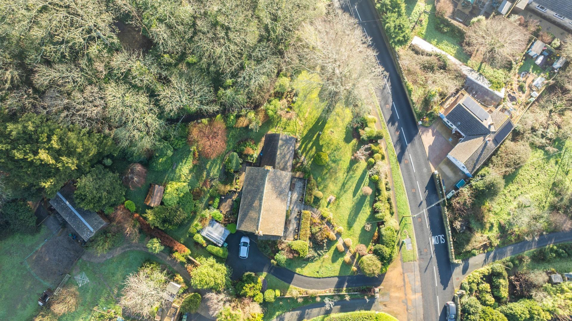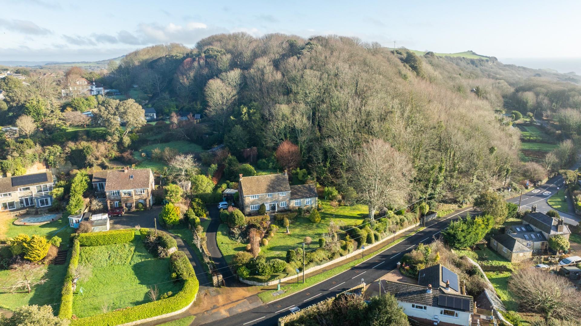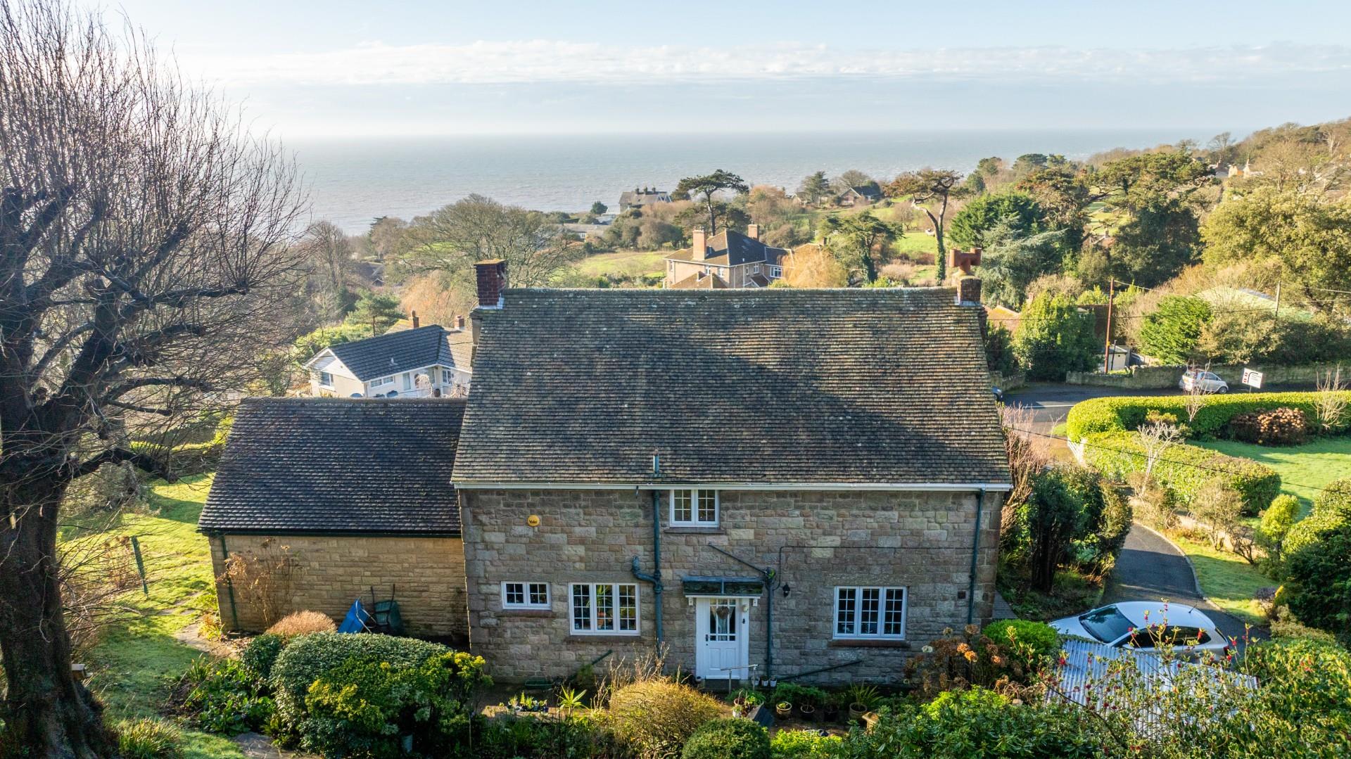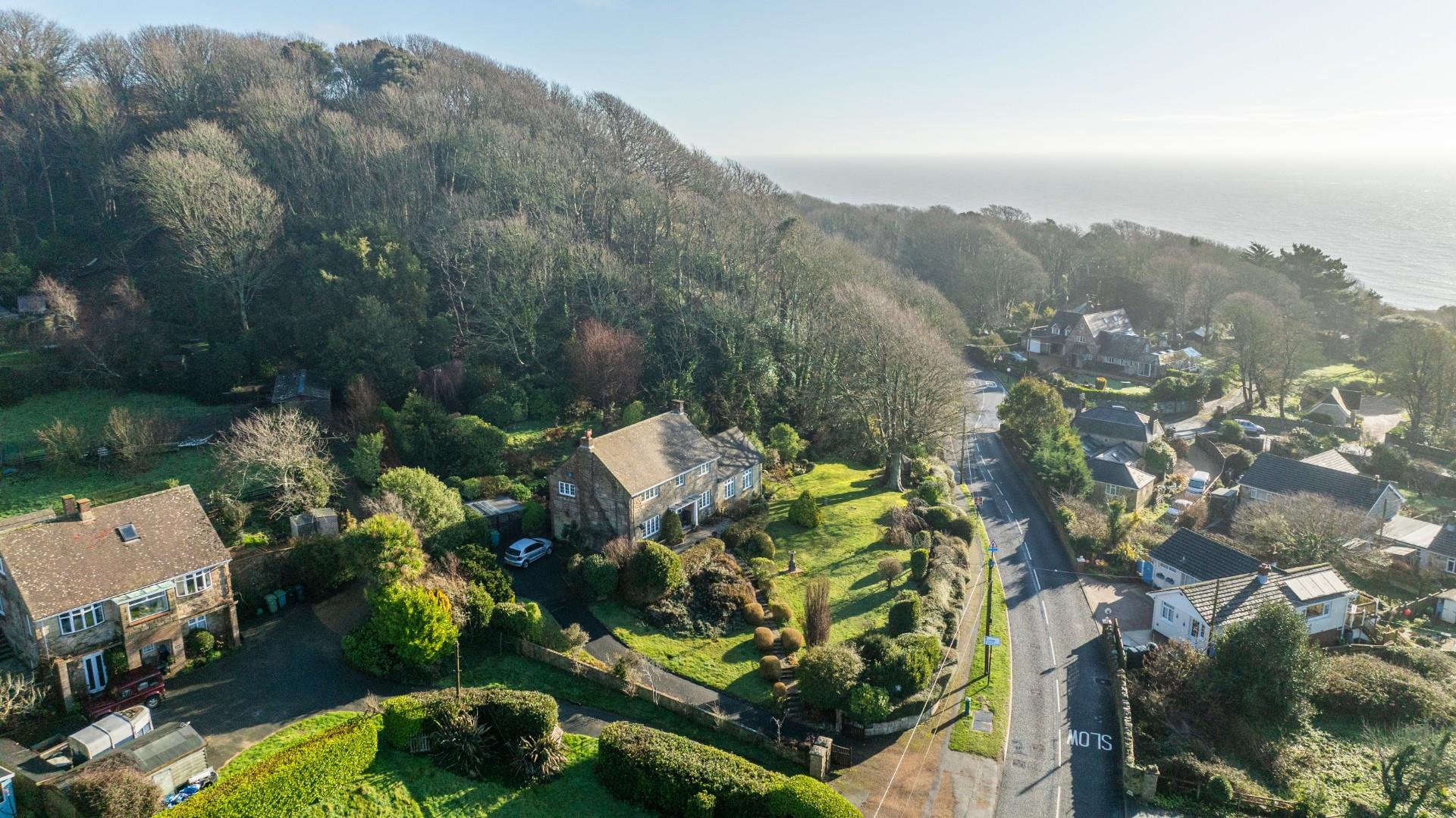 Approached via a private driveway, Woodland Rise sits proudly within its generous plot, surrounded by established gardens and mature planting. The elevated position affords delightful views towards the sea, while the sweeping lawn and landscaped frontage create an attractive first impression. A pathway leads to the entrance of this charming home, and the driveway sweeps up the side of the property.