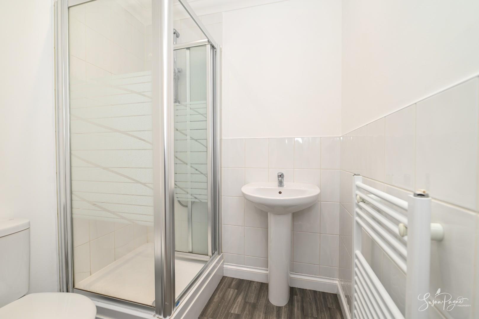Fully equipped with a shower cubicle, WC, and a hand basin, the space is neutrally tiled and is finished with a heated towel rail and an extractor fan.