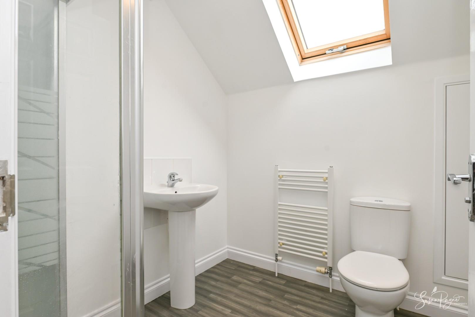 Continuing the décor from the other en-suites, this shower room comprises a shower cubicle, a pedestal hand basin, and a WC and offers additional storage within a cupboard and with access to eaves storage.