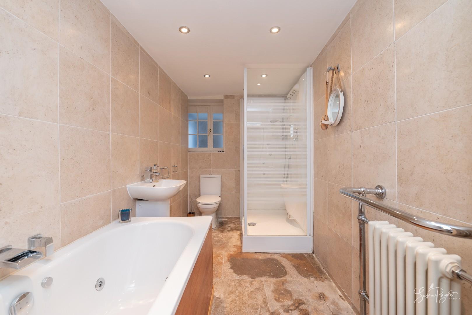Continuing the flagstone flooring, this lovely bathroom comprises a spa bath, a wall-mounted hand basin, a WC, and a separate shower cubicle. There is a window to the rear aspect and an internal stained-glass window. The space is finished with neutral wall tiles and a heated towel rail.