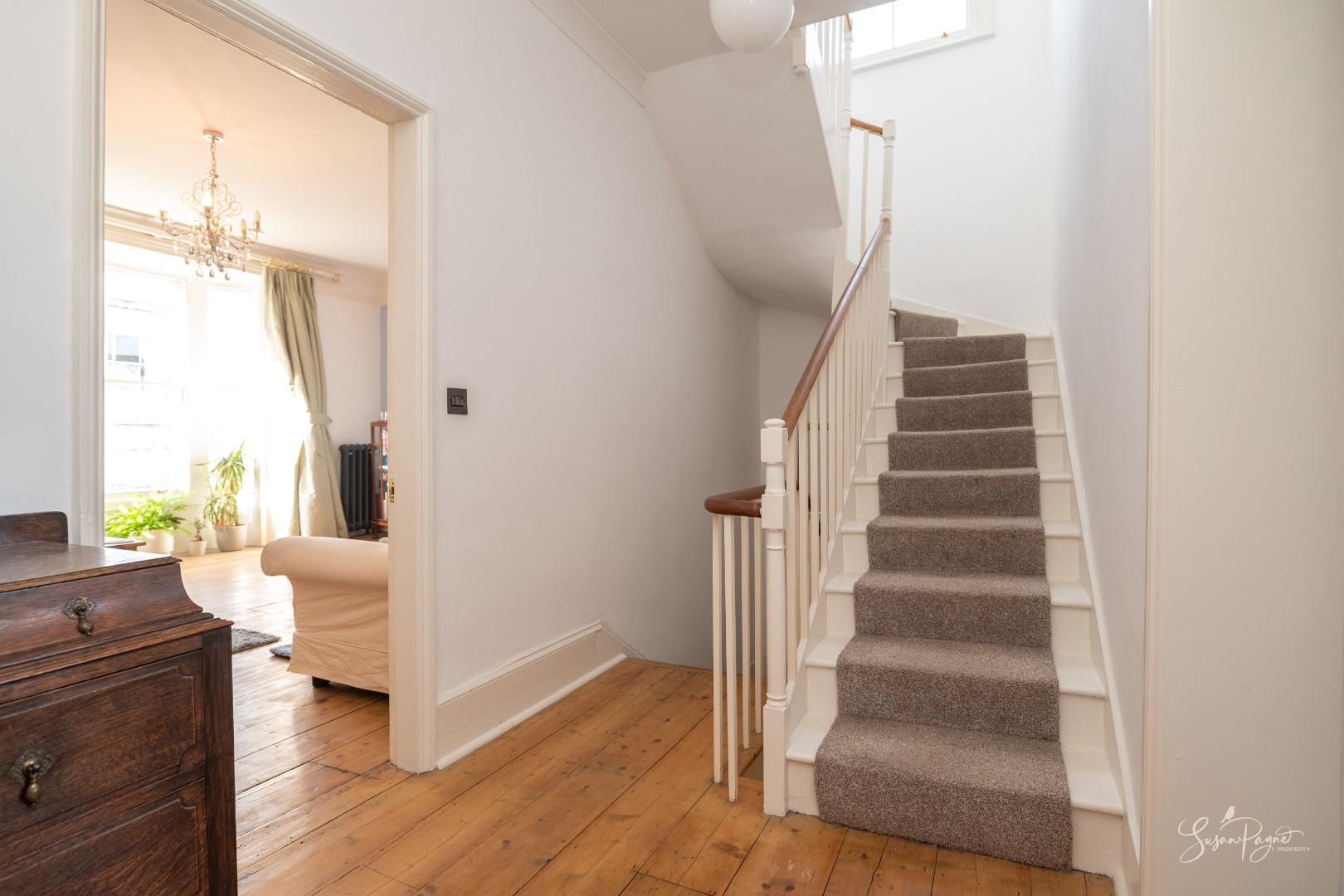 The carpeted stairwell leads up to the first-floor landing, which provides access to the living room, bedroom three, and a shower room. The space benefits from wooden floorboards, which continue into the living area.