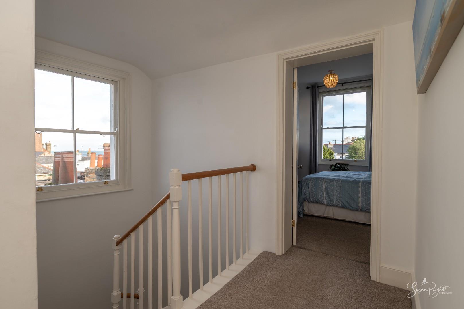 With a window to the side aspect offering sea glimpses, this wonderful landing provides access to three double bedrooms (one with an en-suite).