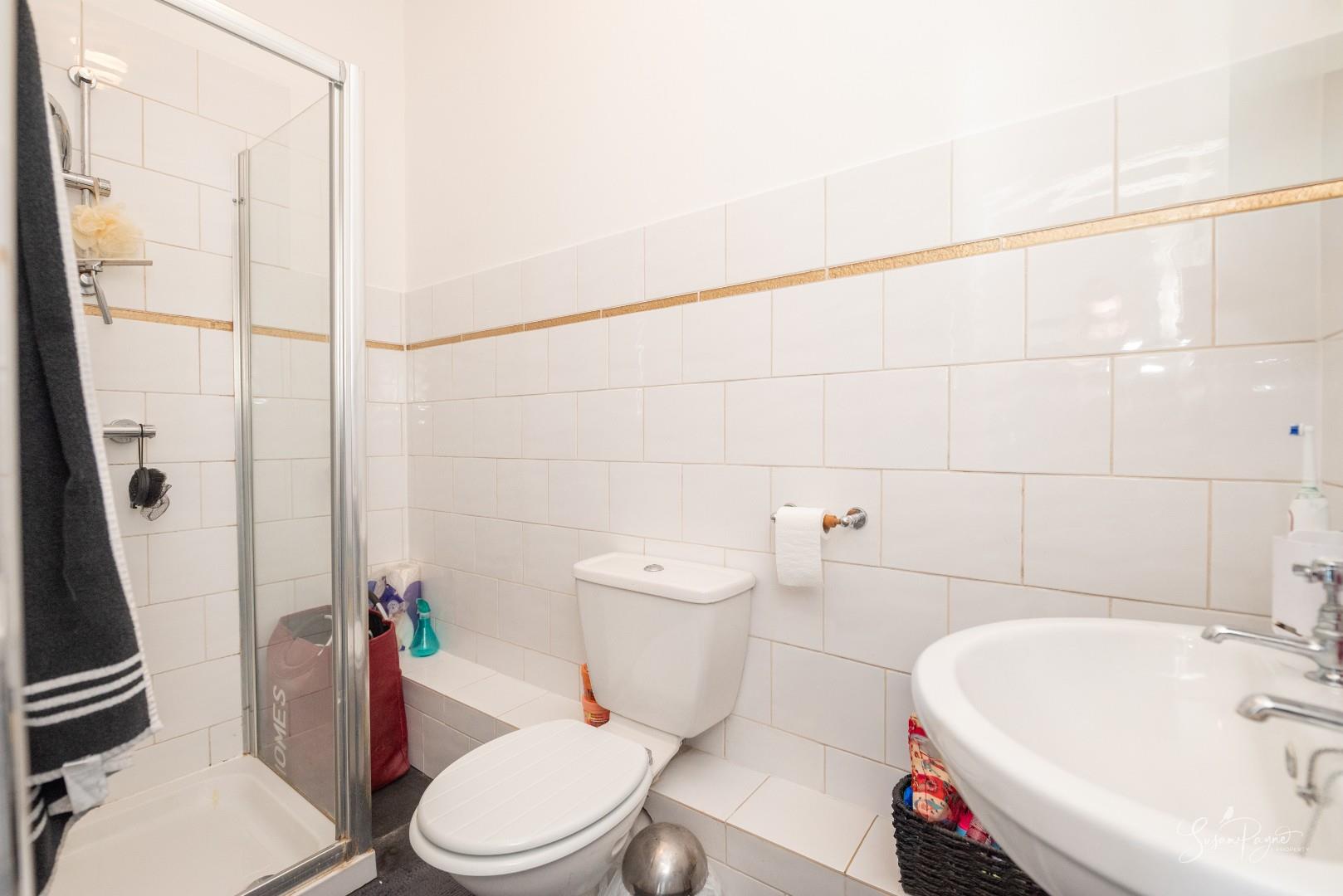 Comprising a power shower cubicle, a WC, a hand basin, and a heated towel rail, this space features an obscure glazed window to the rear and is finished with neutral wall tiling and panelling.