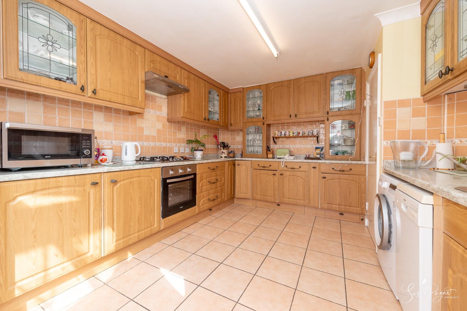 Light and practical, the kitchen offers a range of shaker-style natural wood cabinetry, complemented with light worktops, neutral tiled splashbacks and a practical tiled floor. The kitchen also features an integrated oven, gas hob, and space for appliances. A large pair of glazed sliding doors connect with the conservatory and provide an abundance of natural light.