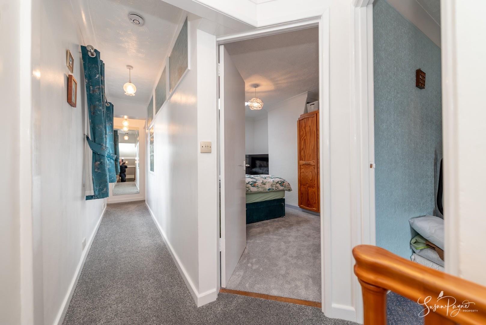 Fresh white décor and a plush grey carpet combine on the first-floor landing, with an abundance of natural light coming from a large window to the side aspect. Doors lead to all three bedrooms and to the bathroom.
