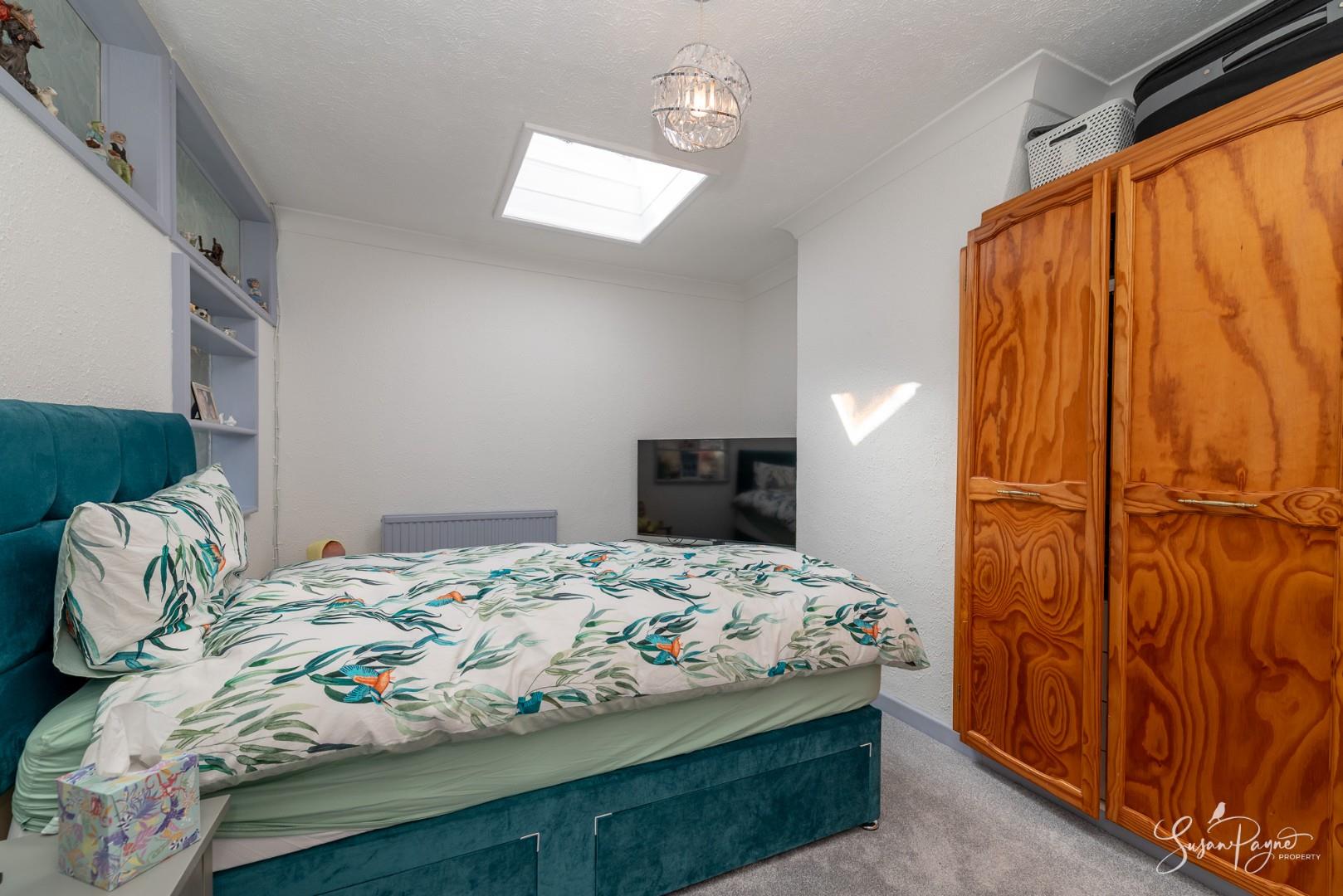 Another comfortable double bedroom with windows to the hallway and a skylight, neutral décor and a useful pair of fitted double wardrobes.