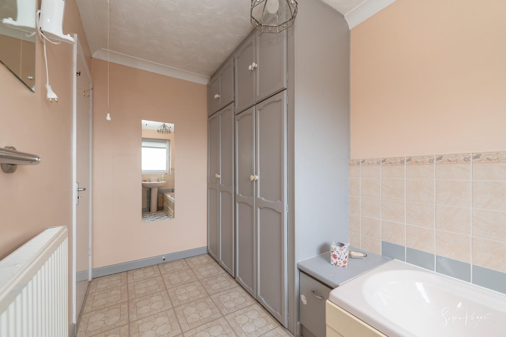 Modern and well-appointed with a full-size bath with a mixer tap, WC, and wash basin set beneath a wide window. Neutral décor and tiling combine and there are two fitted mirrors, plus the bathroom benefits from a large storage cupboard.