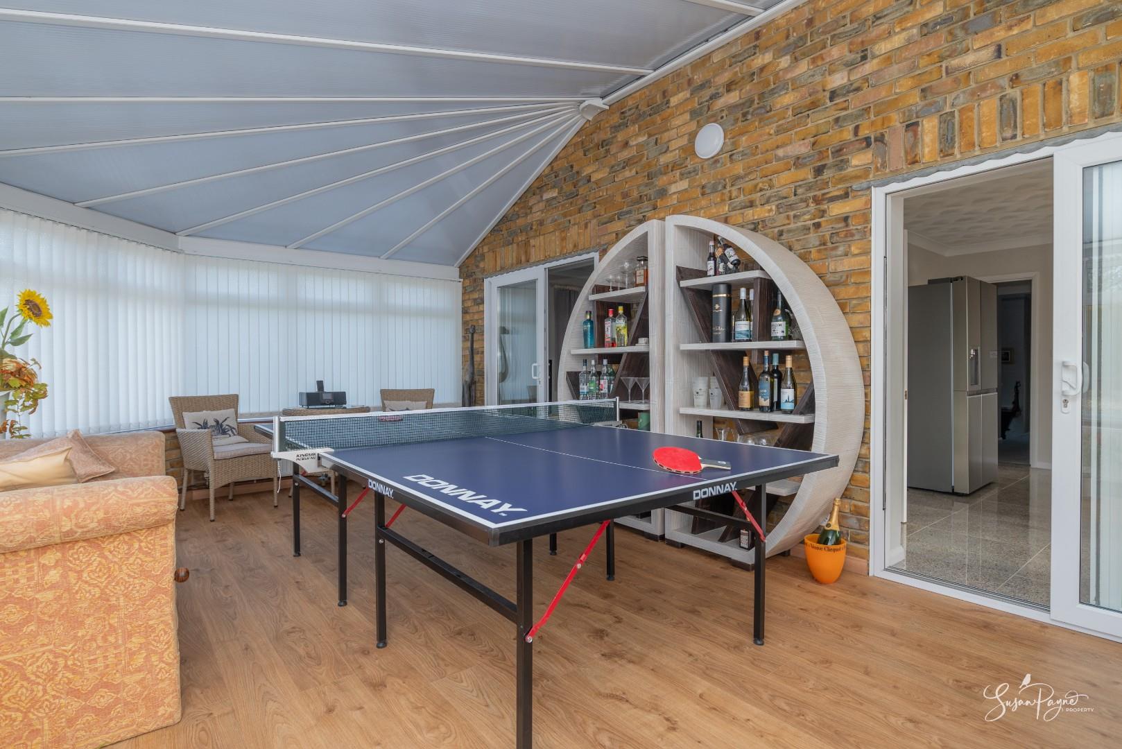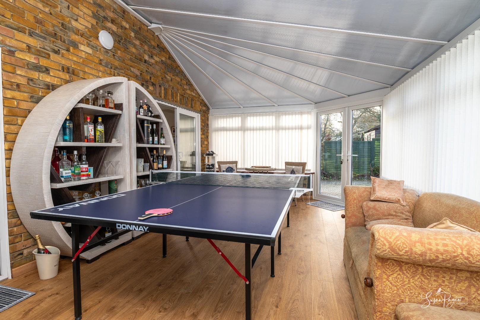 The substantial sunroom enjoys views across the driveway and benefits from heating, allowing year-round use. Currently utilised as an additional reception and leisure space, this light-filled room offers exceptional flexibility — ideal as a garden lounge, games room or entertaining area — with French doors opening directly onto the patio.