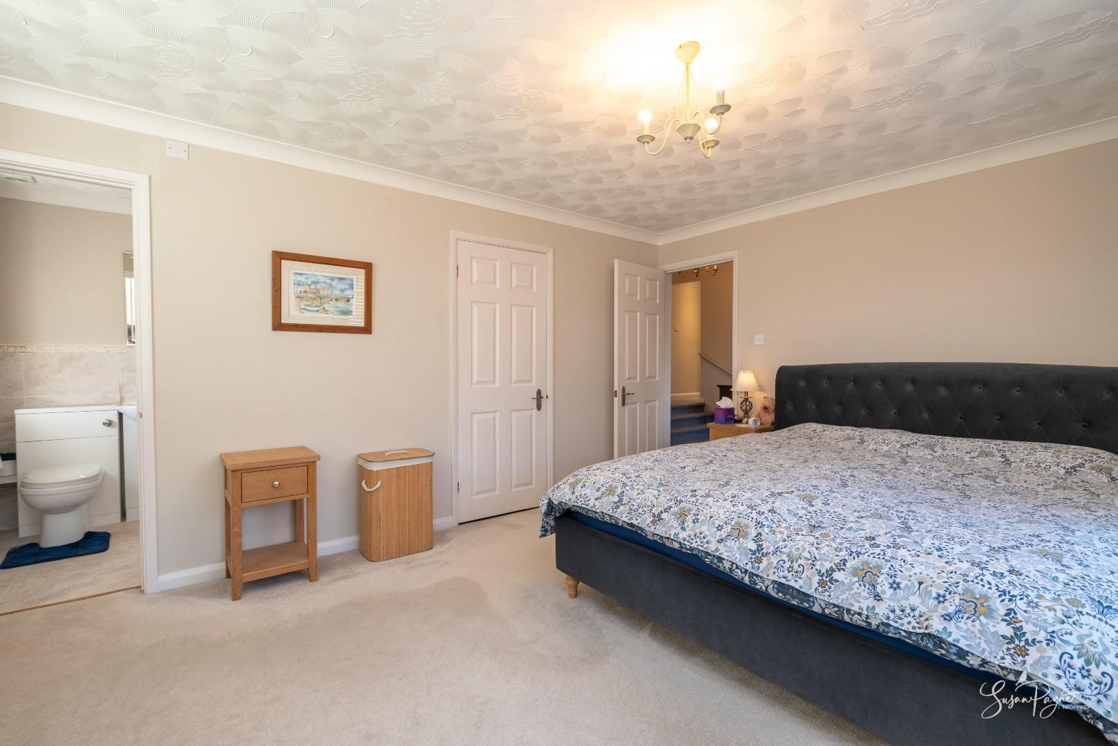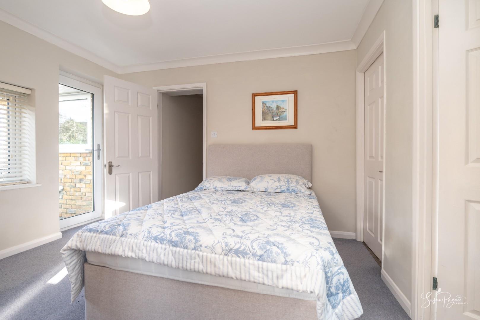 A further well-proportioned double bedroom, this room enjoys the added benefit of its own en-suite shower room, making it particularly suitable for multigenerational living or independent guests. The space also boasts a door to the side aspect and dual aspect windows, which flood the space with natural light.