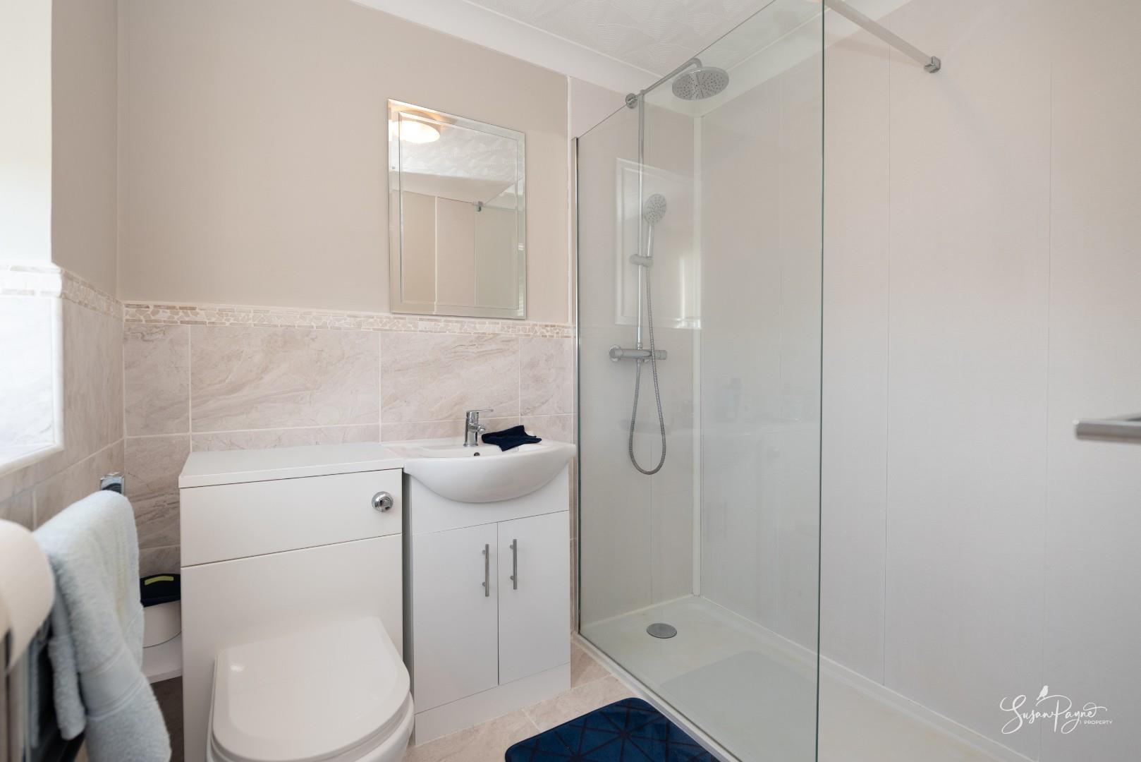 Stylishly finished and comprising a walk-in shower, hand basin and WC, the space enjoys an obscure glazed window to the side aspect.