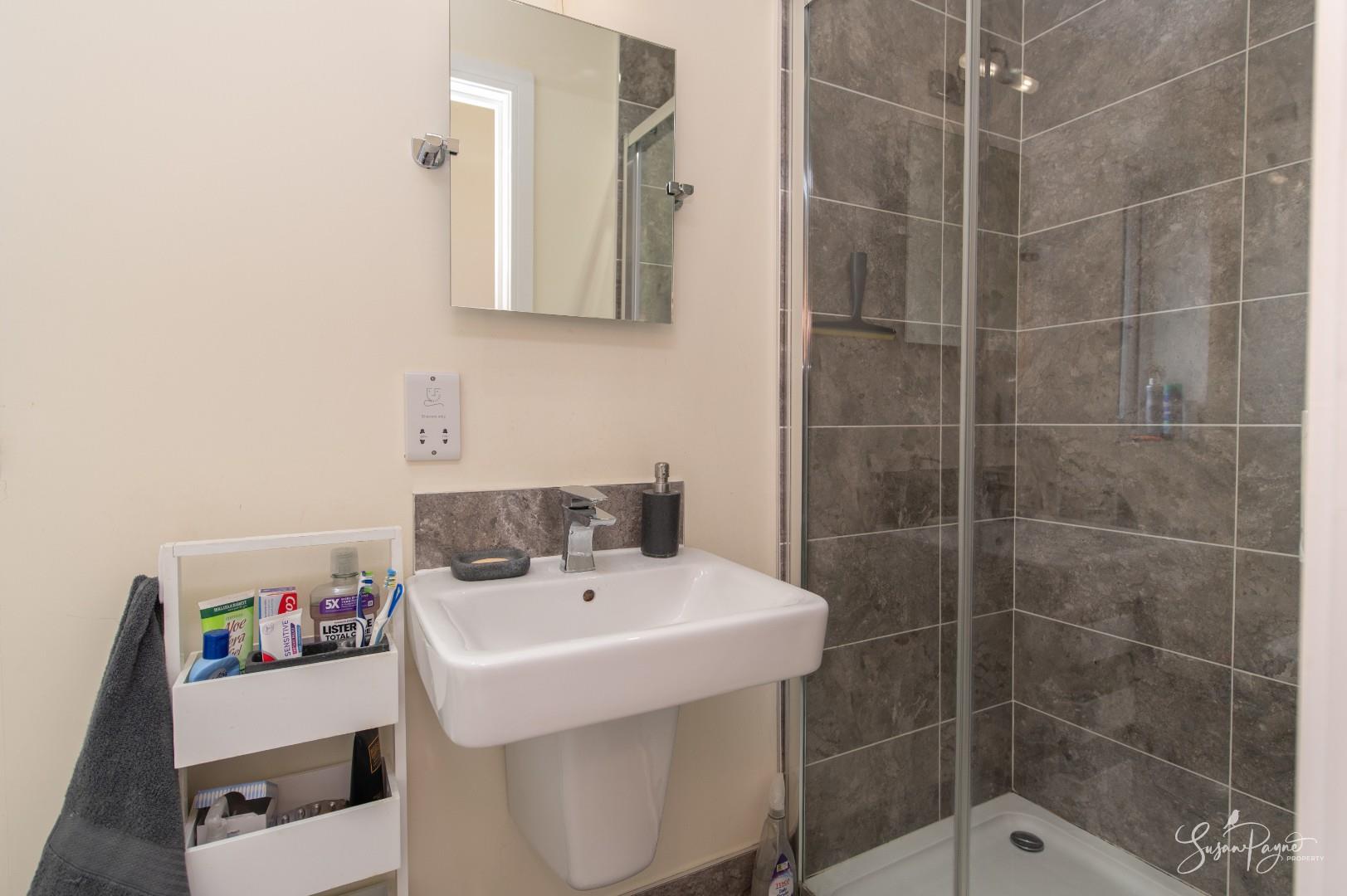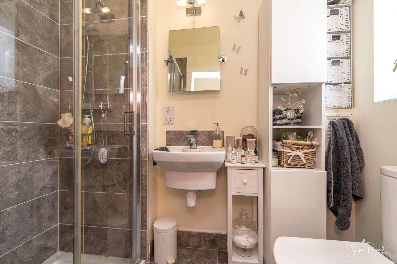Continuing the décor from the other en-suite, this space comprises a walk-in shower, a wall-mounted hand basin, and a WC. An obscure glazed window to the side aspect fills the room with natural light.