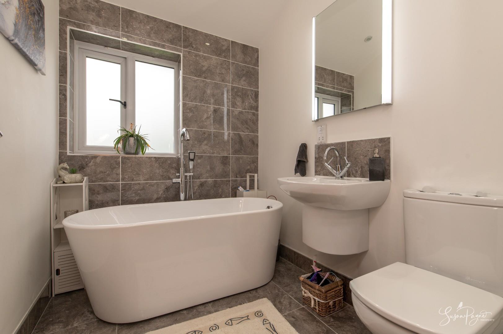 Beautifully finished with stone-effect floor tiles and wall tiles surrounding, this bathroom comprises a large bath, a wall-mounted hand basin, and a WC. Fitted with an illuminated mirror over the hand basin, the space benefits from an obscure glazed window to the side aspect.
