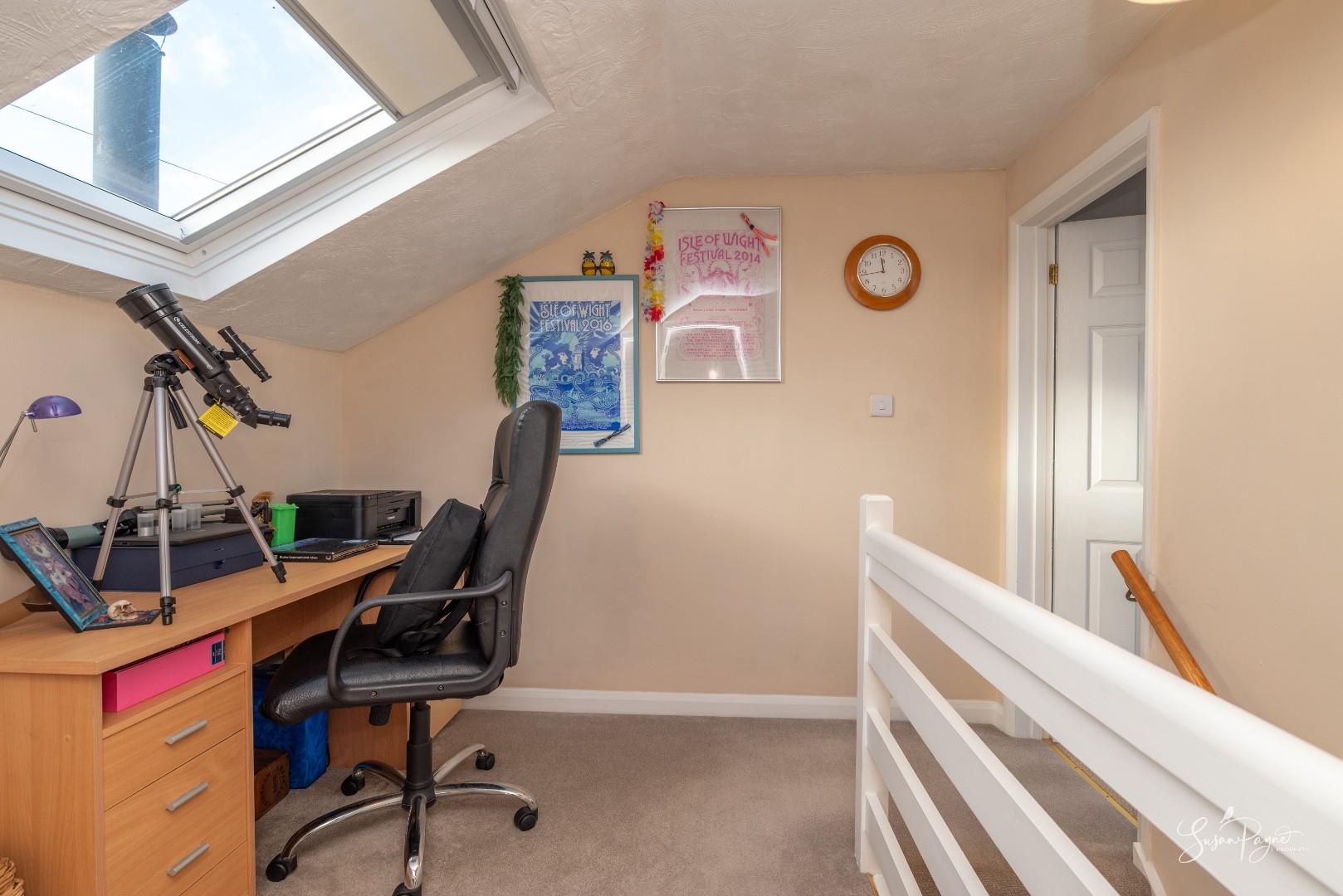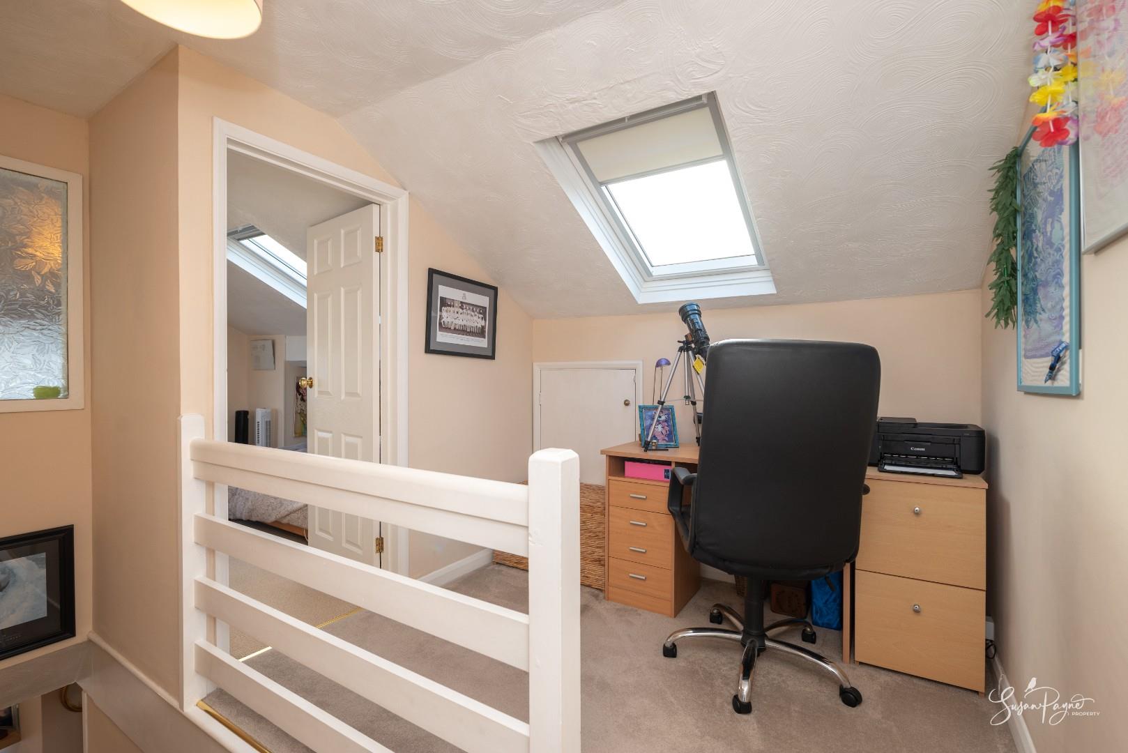 The carpeted stairwell leads up to the first-floor landing, which is currently utilised as an office space, and also provides access to two double bedrooms with a Jack and Jill bathroom. The space is naturally lit by a Velux window.