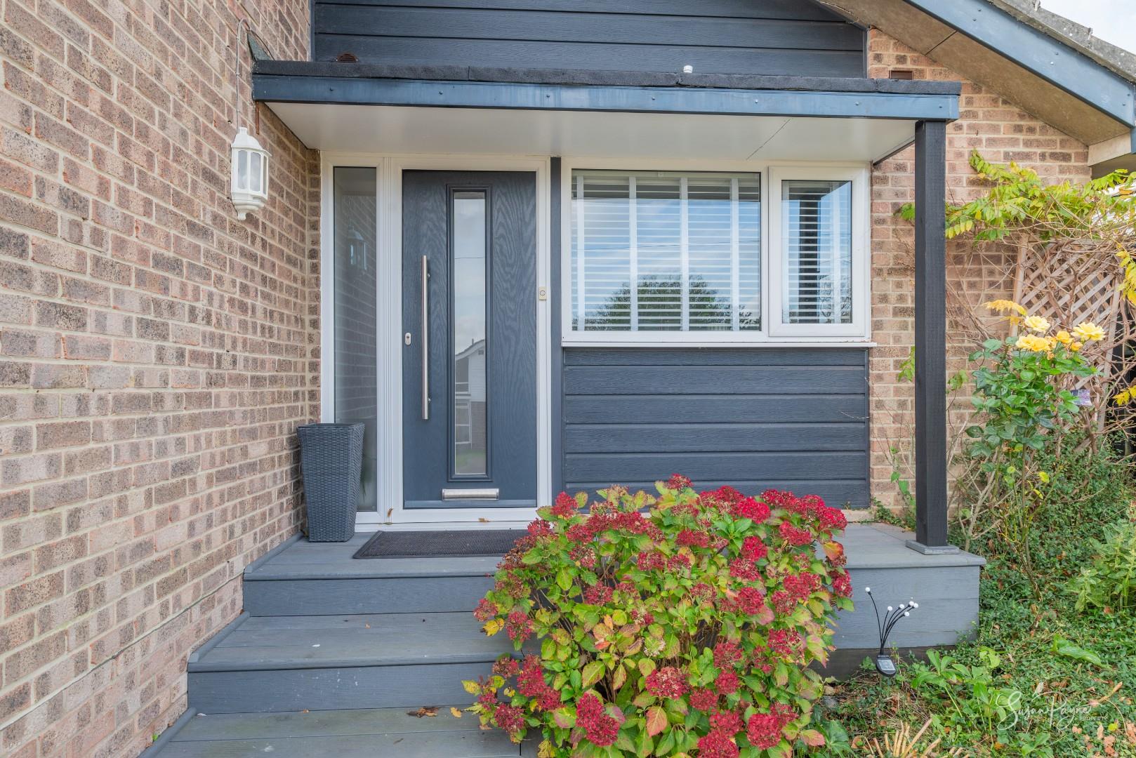 This attractive bungalow is beautifully presented with wood-style cladding and a wonderfully manicured, low-maintenance front garden. The driveway is located to one side, in front of the garage, and a pathway leads to the steps up to the front door.