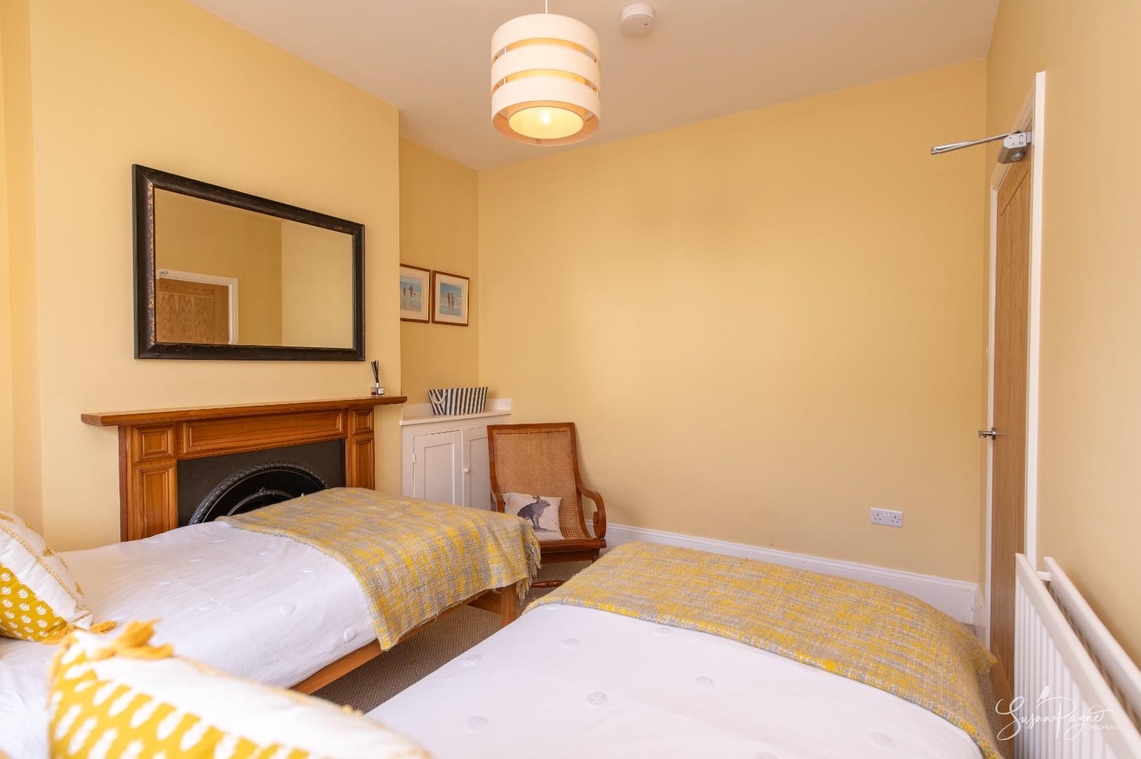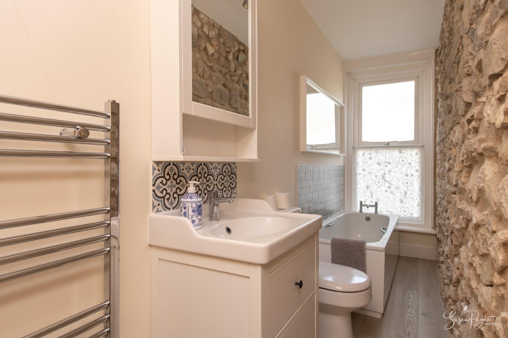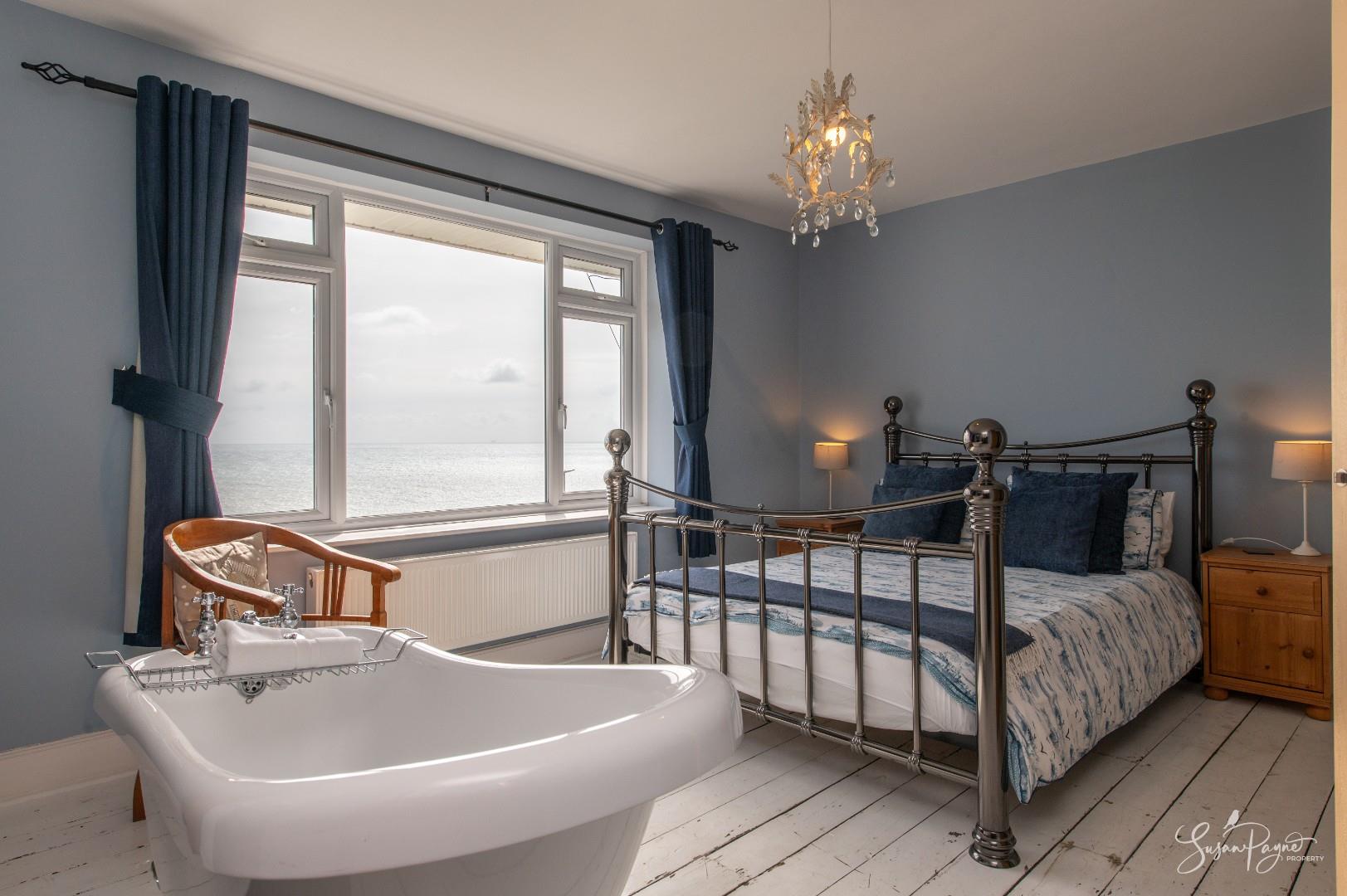 Boasting stunning sea views from the window to the rear aspect, this beautifully bright double bedroom benefits from a roll top bath within the room, which also makes the most of the lovely views. The space is finished with a characterful feature fireplace, painted floorboards, and a built-in cupboard concealing the gas combination boiler and water tank.