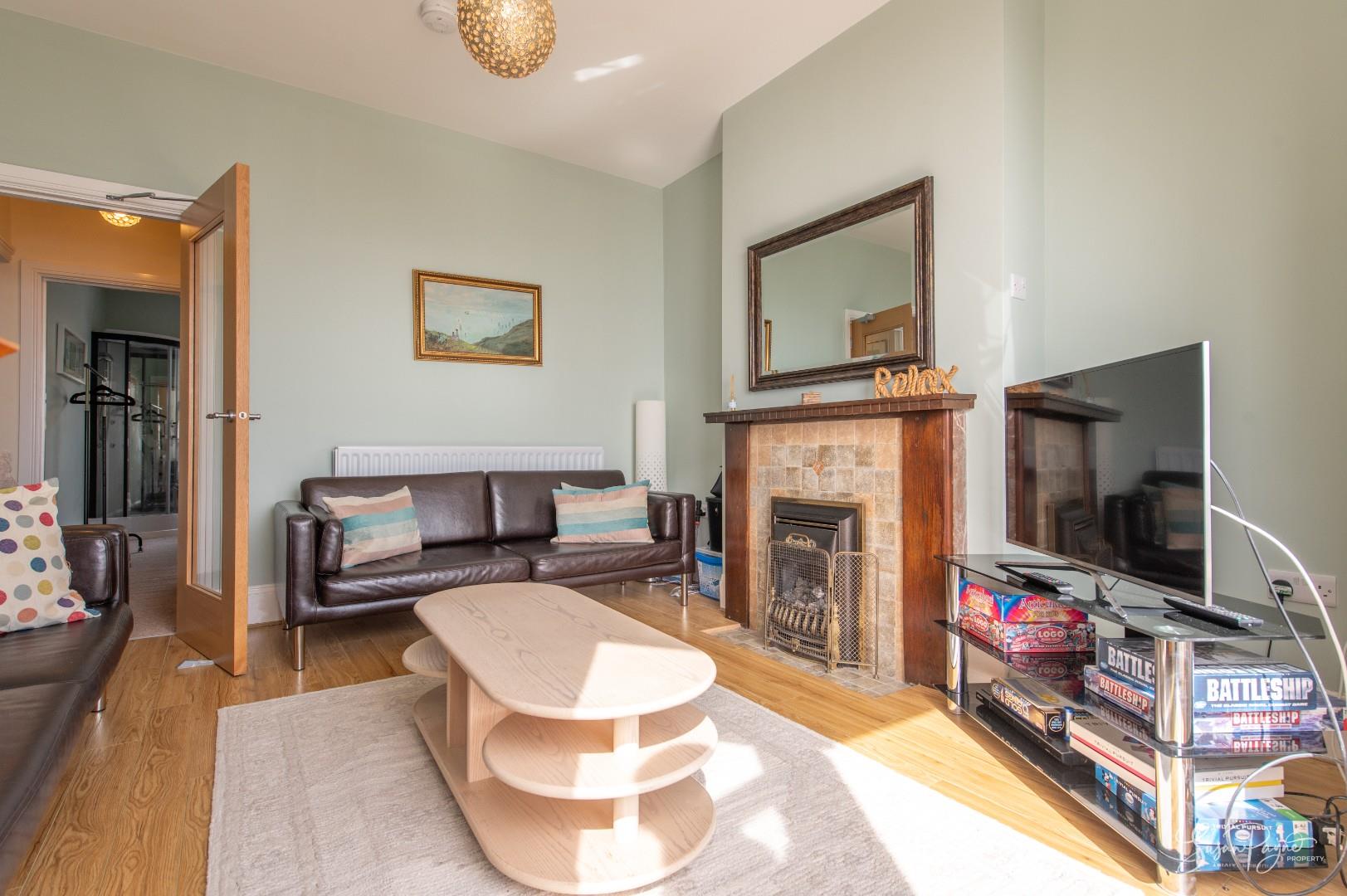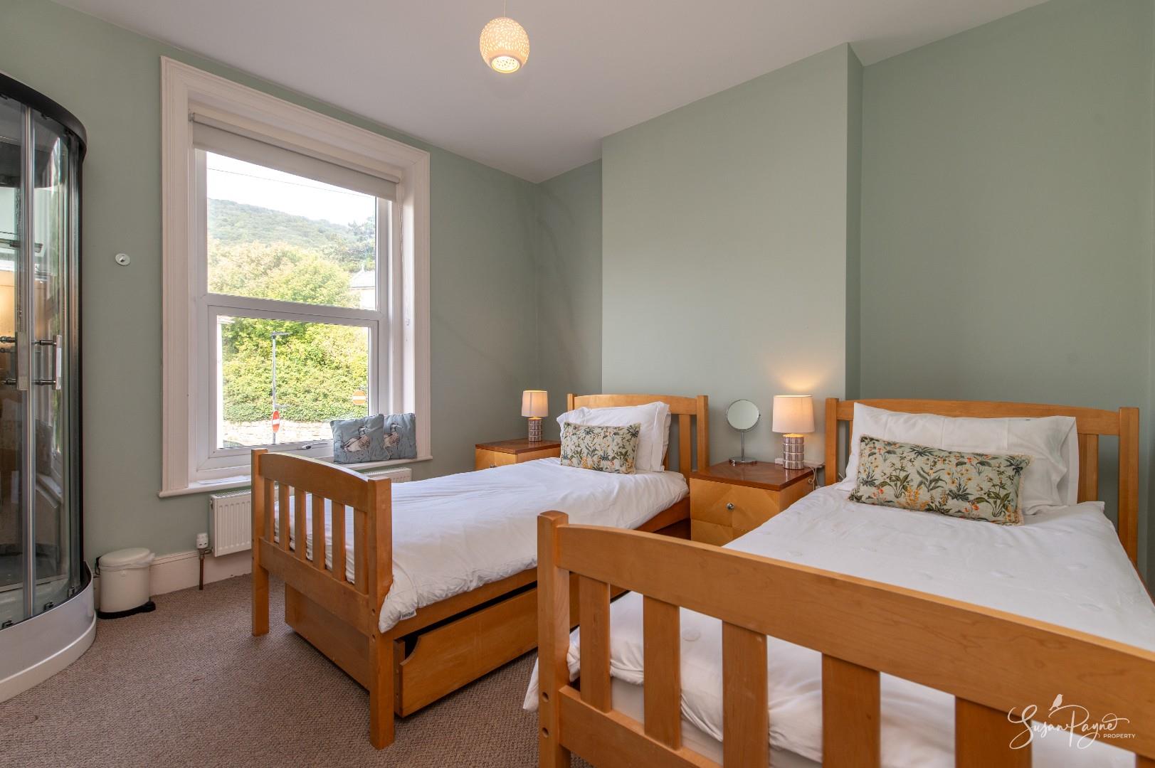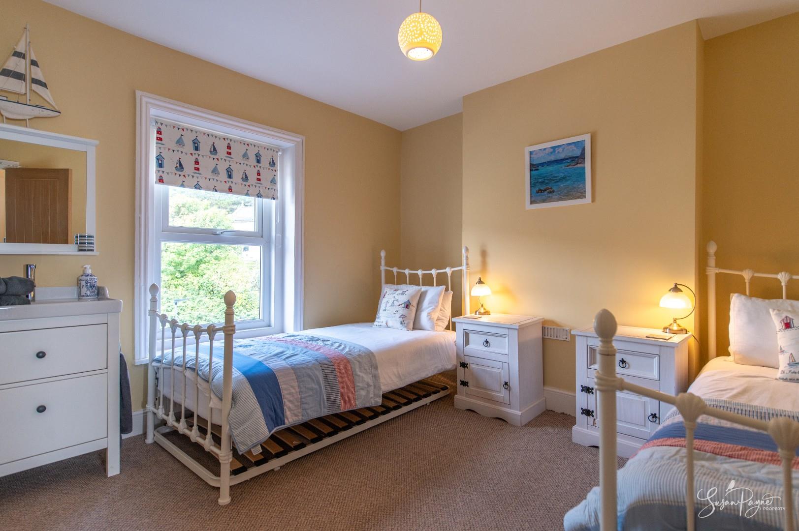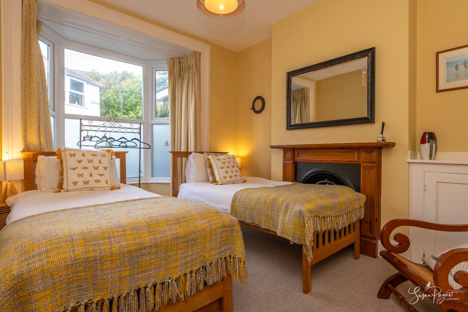 Boasting stunning sea views from the window to the rear aspect, this beautifully bright double bedroom benefits from a roll top bath within the room, which also makes the most of the lovely views. The space is finished with a characterful feature fireplace, painted floorboards, and a built-in cupboard concealing the gas combination boiler and water tank.