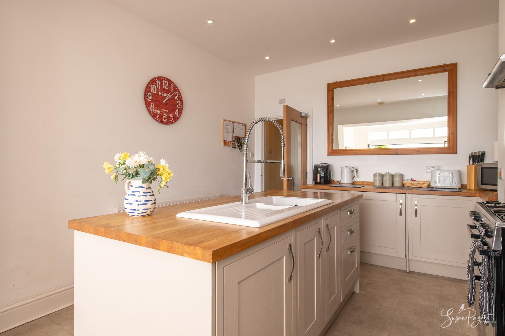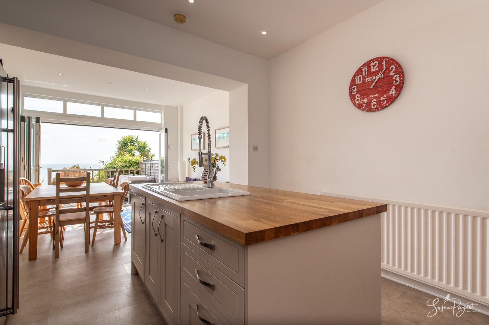 Situated at the heart of the home, this wonderful kitchen-diner offers plenty of space for all the family. The kitchen offers a fantastic amount of storage as well as integrated appliances, including a dishwasher, washing machine, and bin storage, which can be found within the neutral base units. A kitchen island offers additional storage as well as a beautiful sink and drainer integrated into the wooden worktops, plus there is an alcove with a large American-style fridge freezer, and a range-style cooker with an extractor fan over. With space for a large dining table, the entertaining space currently offers space for a sofa, making it the ideal socialising and entertaining space. With bifold doors to the rear, leading out to a small terrace, it provides the room with magnificent sea views and creates an inside/outside feeling to be enjoyed on those warm summer days.