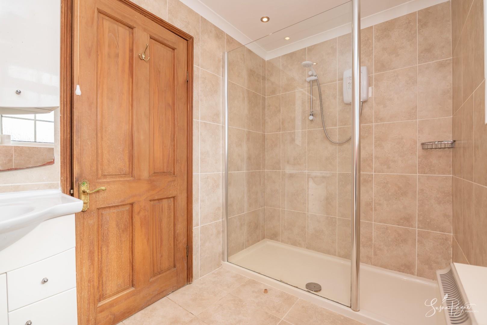 Finished with neutral floor and wall tiles, this fantastic shower room boasts a large walk-in electric shower, a vanity hand basin, and a corner WC. The space is finished with an obscure glazed window to the front aspect.